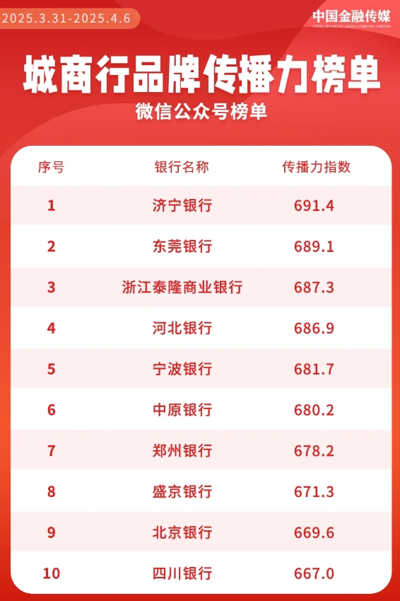 近日,从济宁银行获悉,由中国金融传媒官方统计的城商行品牌传播力周榜发布,济宁银行在本期微信公众号传播力排行榜上,发文质量较高,获得691.4的传播力指数,夺得榜首。