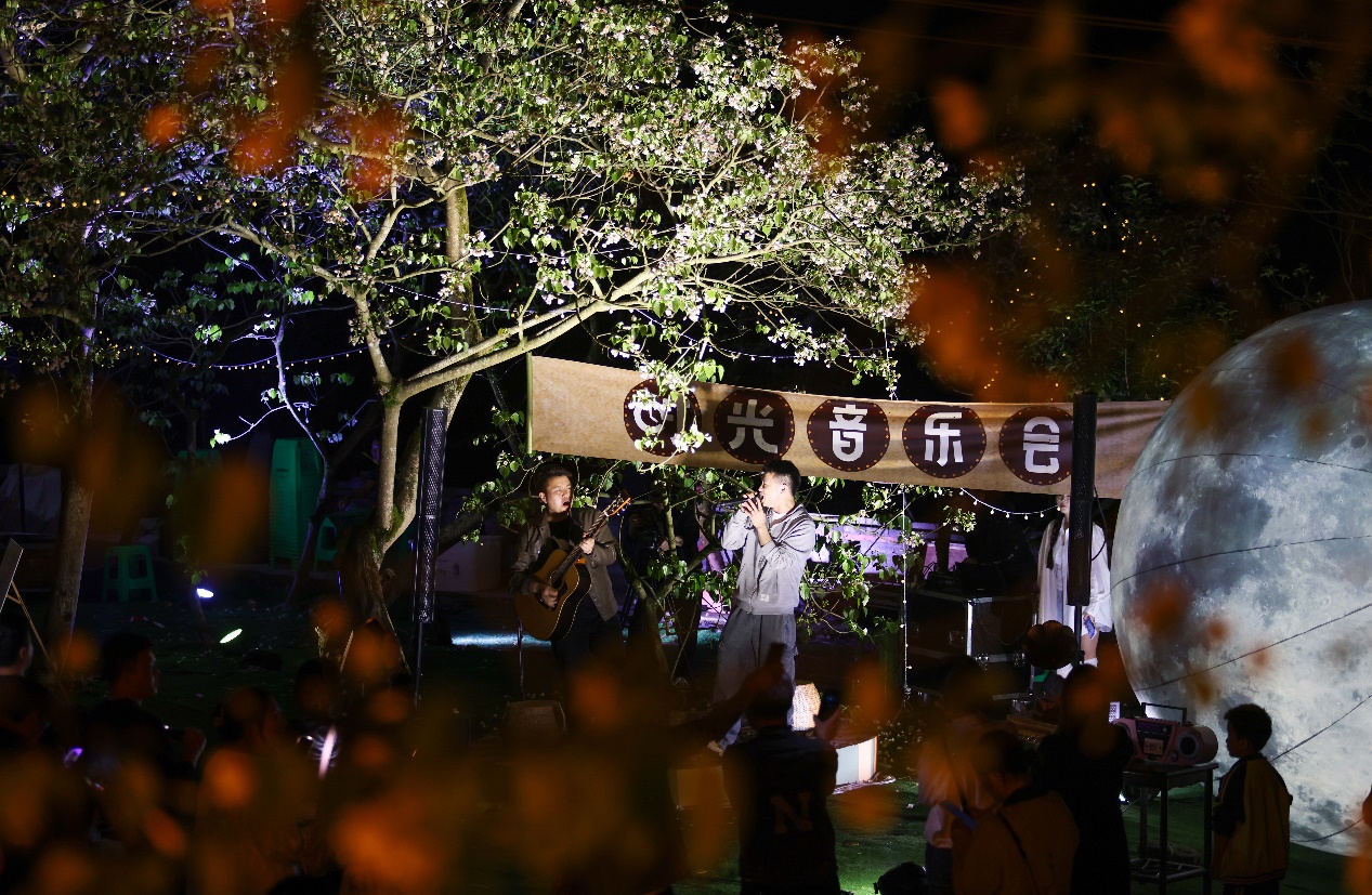 活动现场设置特色灯带勾勒花影,露天茶座提供各种美食供品鉴。游客王女士表示:"夜赏桐花让传统赏花有了新体验,既浪漫又热闹。"据了解,正安县和溪镇第二届桐花乡村文化旅游节将于4月12日开幕,旨在以花为媒推动乡村旅游发展,助力乡村振兴。(赵永章文/图)