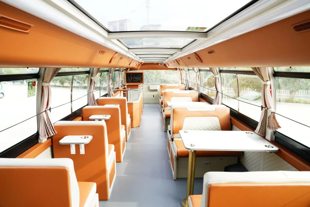 穿行于此的安凯双层观光巴士车身设计别具匠心,配色明快鲜活,线条圆润流畅,巧妙地将建水的知名景点串联起来,乘客们登临其上,仿佛穿梭在一幅幅立体的流动画卷之中。整车内部设计充分考虑了乘客的乘坐体验,配备了软包座椅、空调、雨伞、冰箱、电视、USB插孔等,并提供茶水、咖啡,车行景移间细品车窗外建水古城的烟火气。
