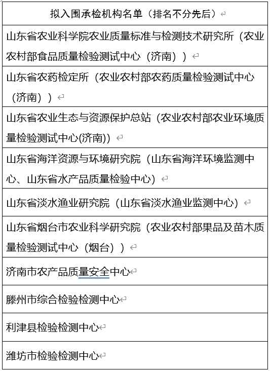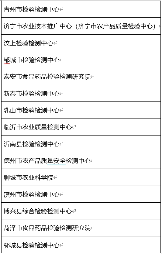 济宁地区三家入围,分别为济宁市农业技术推广中心(济宁市农产品质量检验中心)、汶上检验检测中心、邹城市检验检测中心。