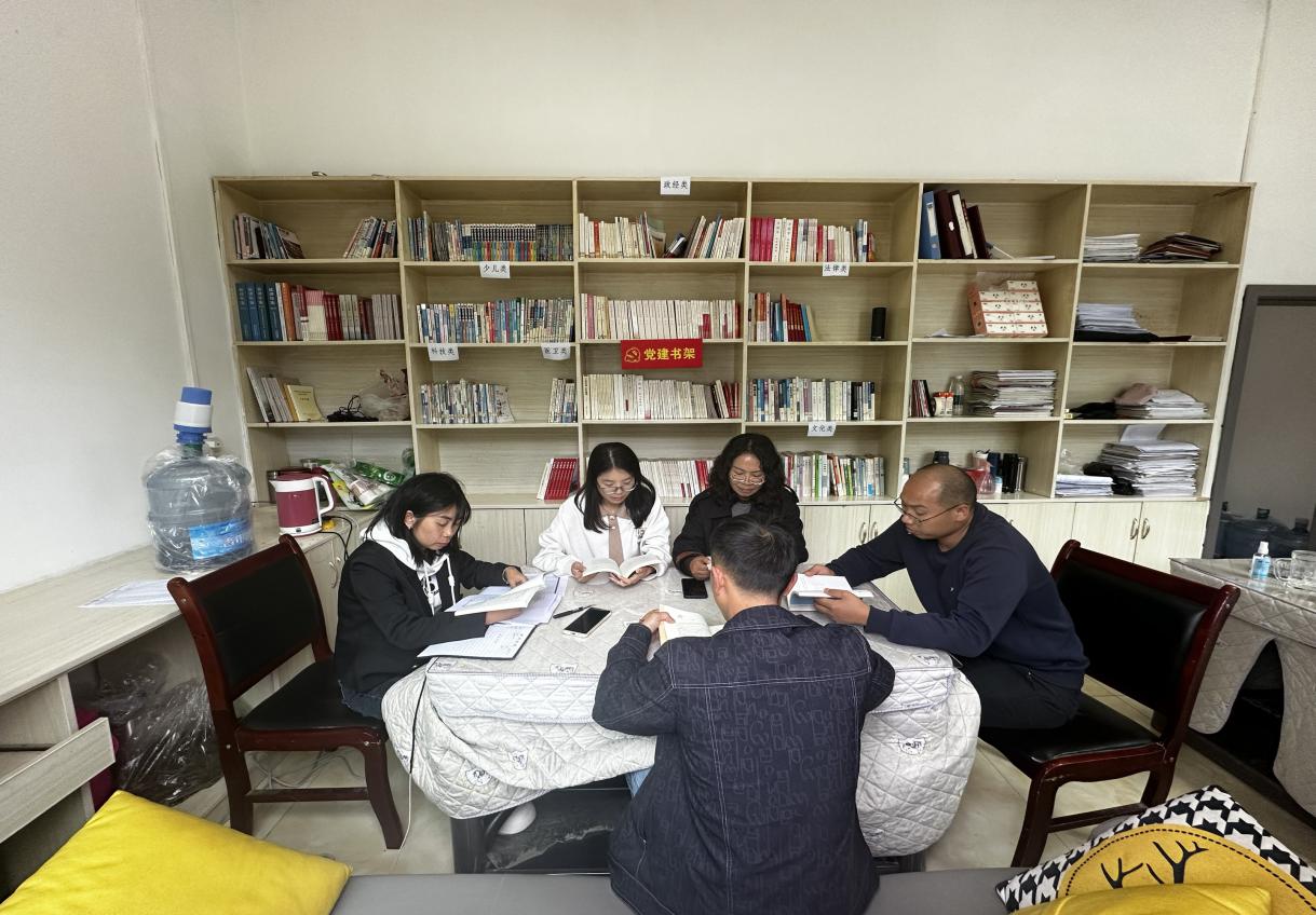 4月23日,在昭通市盐津县牛寨乡万和村委会农家书屋,中国人寿财险云南省分公司第一书记张绍碧,村委成员杨奇、肖娟,村民侯文钊、何贤会在一起阅读。(袁翔摄)