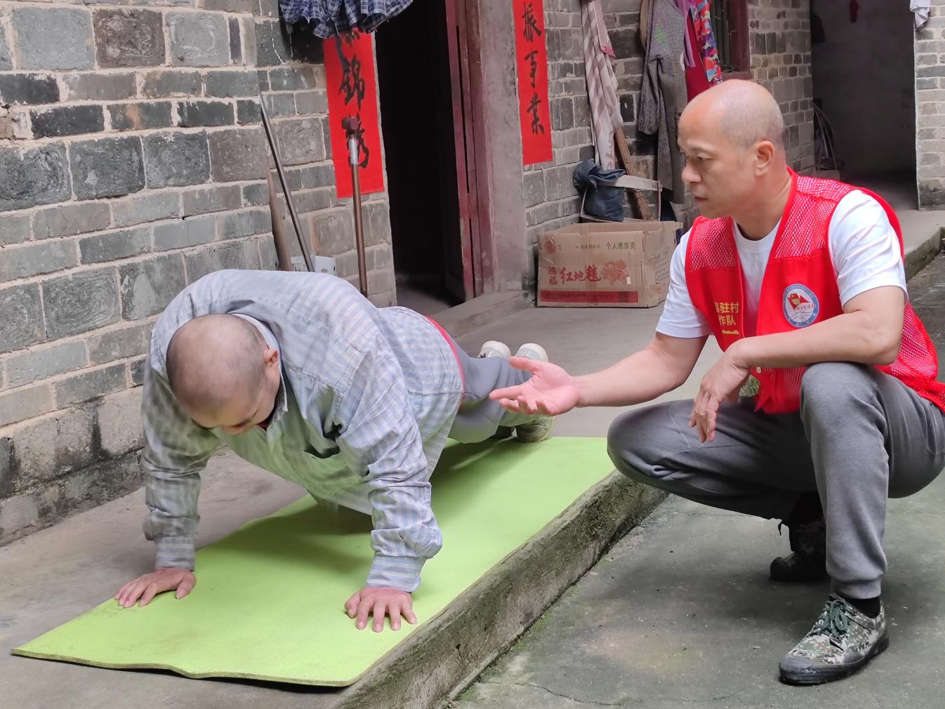 “朱大哥,今天咱们试试扶着墙走!”黄弘在入户遍访中发现监测户朱某因中风卧床,生活无法自理,屋内环境脏乱,仅靠精神残疾的弟弟勉强照料,黄弘当即申请调整自己作为朱某的帮扶人,立下“帮助他恢复健康”的目标。朱某曾绝望地说:“我这辈子就这样了。”但黄弘不认命,他用专业康复知识为朱某制定训练计划,每周一次的康复训练成了雷打不动的“约定”:从最初搀扶走三步就大汗淋漓,到后来能独立行走,57次入户记录本上密密麻麻记满进步点滴。当朱某向黄弘提出“想理一个和你一样的光头”时,黄弘欣然答应。如今,这位曾深陷绝望的村民已能笑着畅想未来:“等完全康复了,我要买辆小汽车去广东见当年的小芳!”