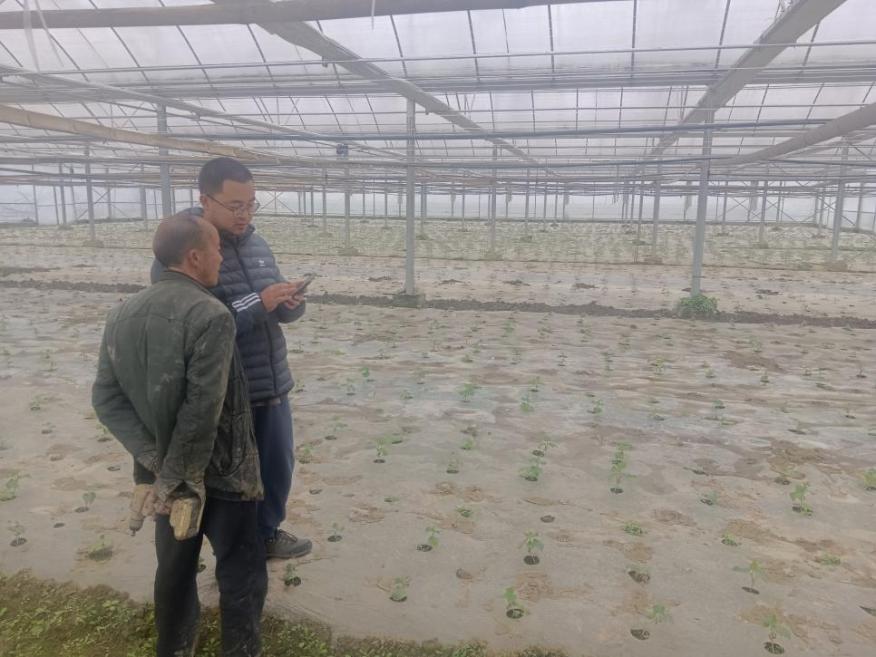 图为驻村第一书记刘宇鹏向种植大户介绍最新天气信息