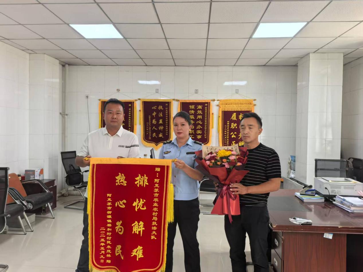 “因为邻居喷洒除草剂,飘到了我200亩的棉花地里,给我的棉花造成了损失,多亏我们的执法干部帮忙,我才能这么快就收到棉花补救的补偿款。”5月9日,在新疆阿克苏市农业农村局,柳源镇农民将一面鲜红的锦旗交到农业综合行政执法大队执法人员的手中。这起农药纠纷的解决赢得了当事人的满意。