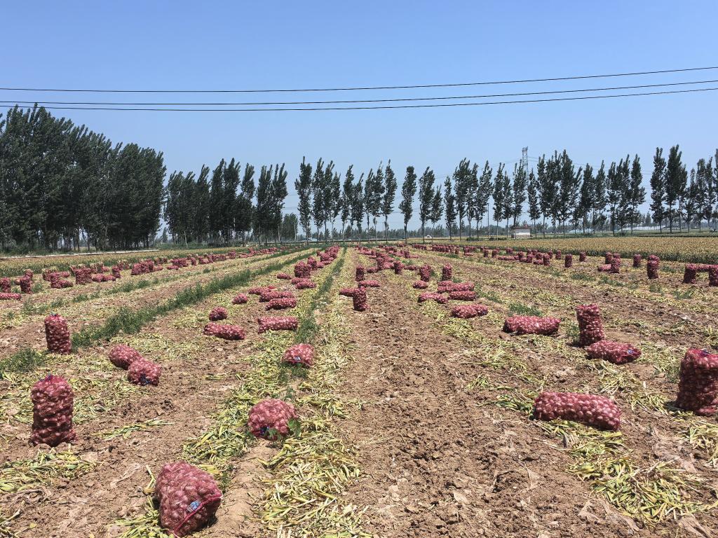 在山东商河县白桥镇的连片蒜田里,一袋袋刚采收的大蒜等待装车。(受访对象供图)