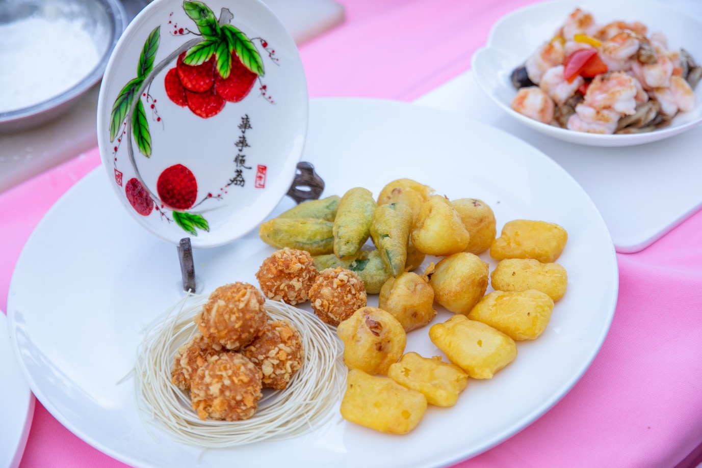 当日下午17时,伴随着欢快的竹竿敲击声,身着黎族传统服饰的舞者们翩翩起舞,吸引了众多市民游客的目光。在热烈的掌声中,观澜湖度假区代表携特邀主厨与嘉宾共同为美食月启幕。主厨们以火山荔枝为灵感,现场创作了天妇罗果蔬熔岩荔枝球、焦香红松茸炒虾球等菜品,让在场的嘉宾及游客领略到了海口独特的美食风情。“这道荔枝球口感太惊艳了,外酥里嫩层次丰富,在泡温泉之余还能邂逅这样的美食盛宴,真是太惊喜了。”来自山西的游客李女士一边品尝一边赞叹道。
