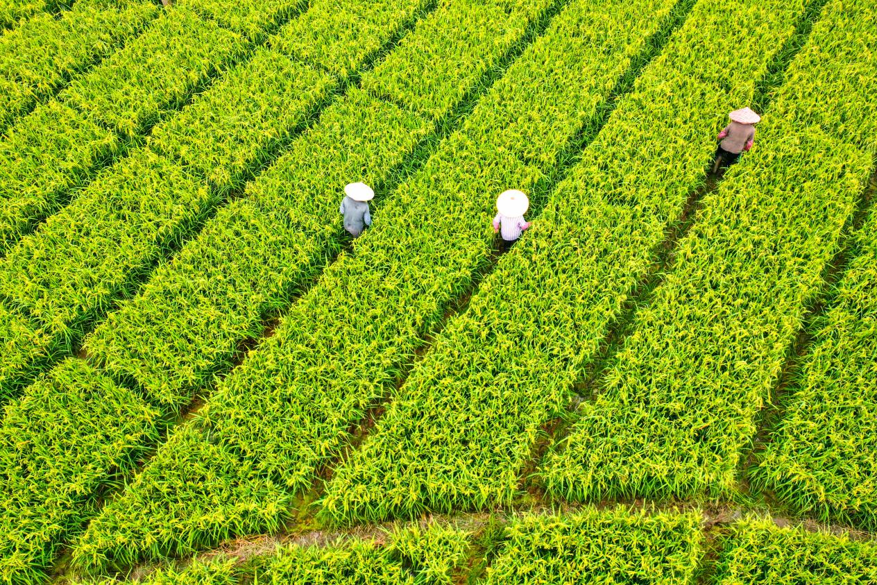 2025年6月1日,广西梧州市藤县藤州镇潭东村水稻制种基地内沟渠纵横,技术员正在田间观察检查制种水稻的稻穗饱满情况,杂交制种水稻陆续进入成熟期。