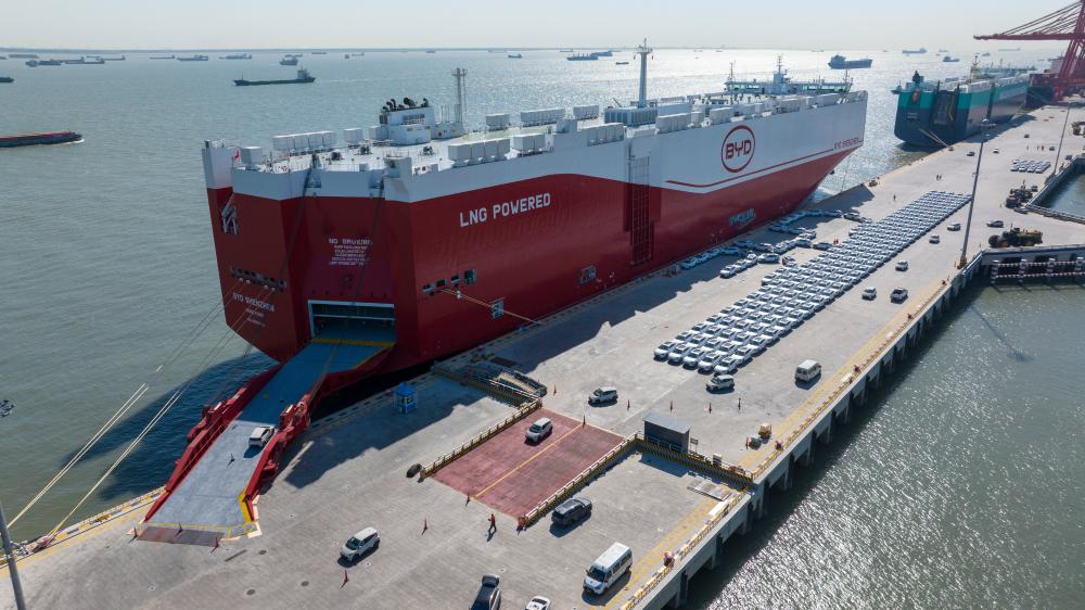 出口汽车在苏州港太仓港区码头集中装载上“深圳号”汽车运输船。