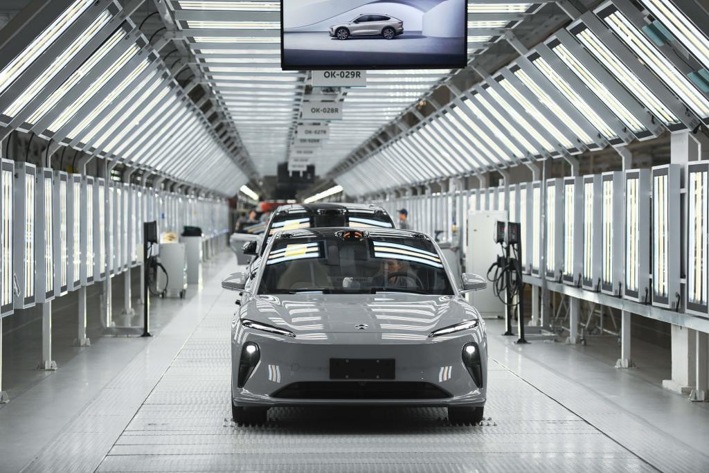 这是在安徽省合肥市新桥智能电动汽车产业园蔚来第二工厂拍摄的新能源汽车生产线。