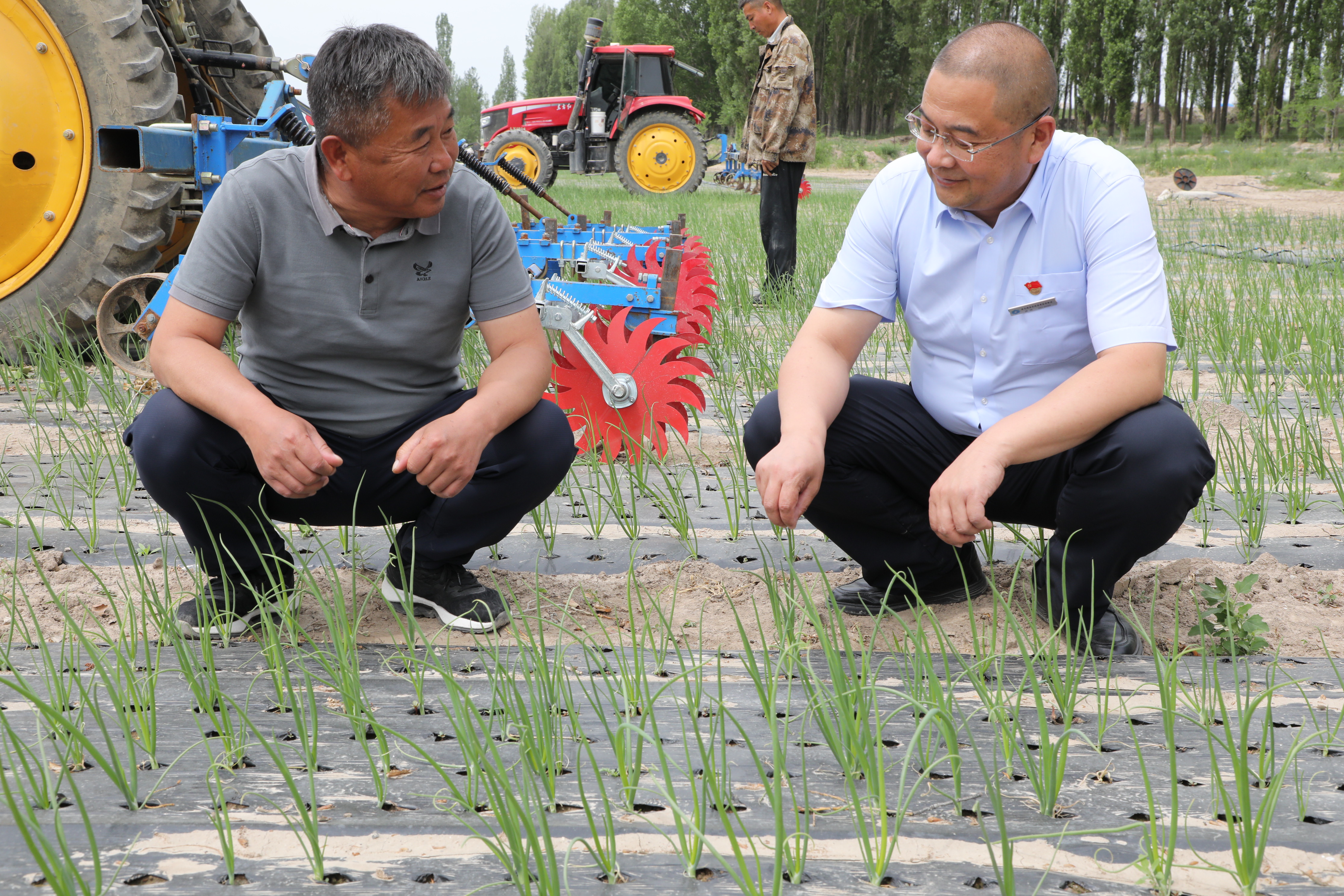 图为6月3日,特克斯县农信社工作人员在向贷款户(左一)了解洋葱种植情况。刘子刚摄