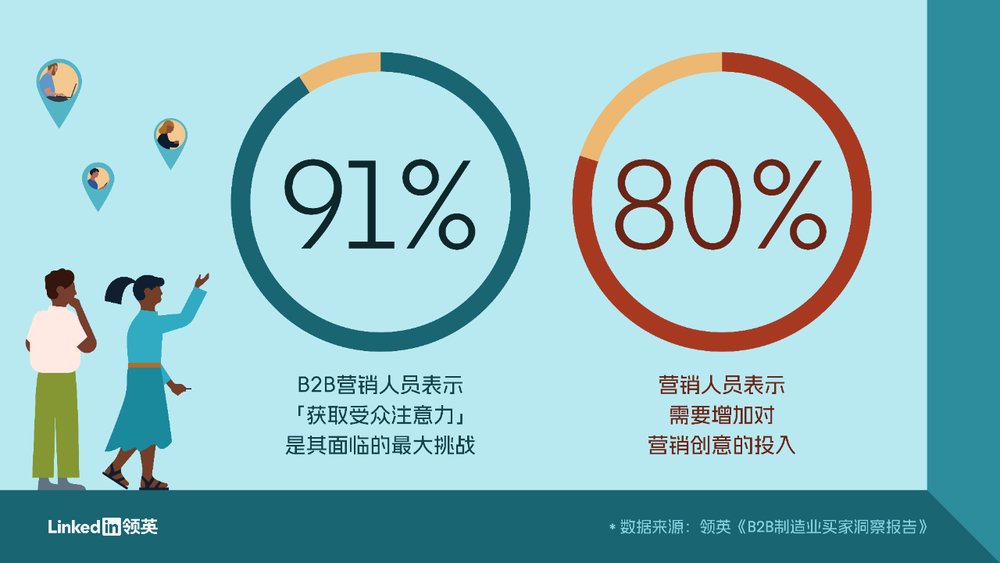 根据领英最新发布的营销调研数据,全球91%的B2B营销人员表示“获取受众注意力”是其面临的最大挑战。而全球80%的营销人员表示需要增加对营销创意的投入。