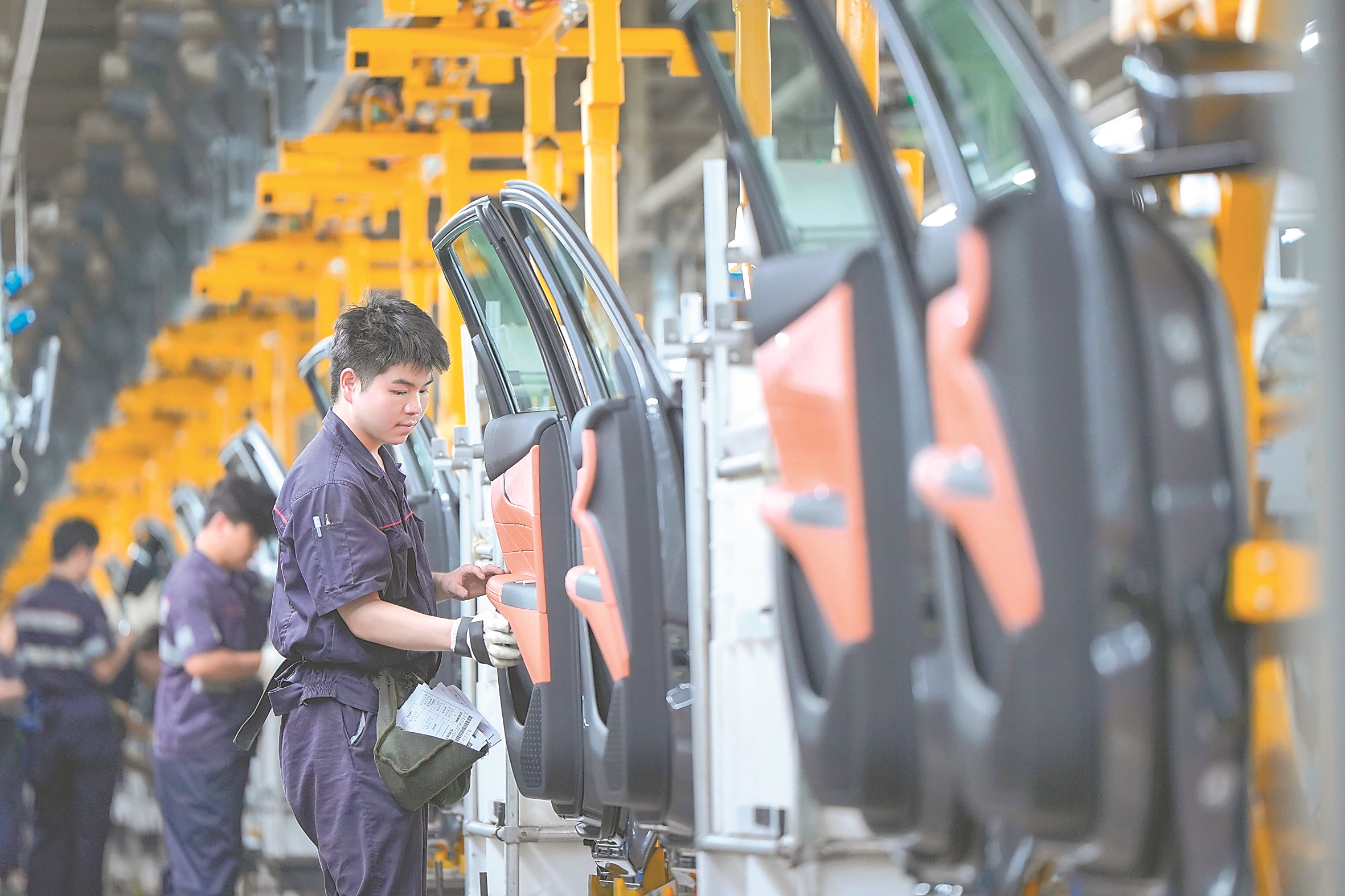长安汽车合肥公司总装车间生产线上,装配工人熟练地安装零件、组装车辆。