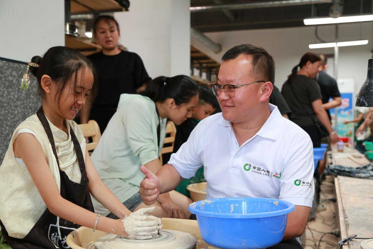 6月14日,在建水紫陶产业学院陶艺实训中心,中国人寿财险云南省分公司工作人员为正在体验陶艺制作的小朋友点赞,感受非遗文化。(薛莹莹摄)