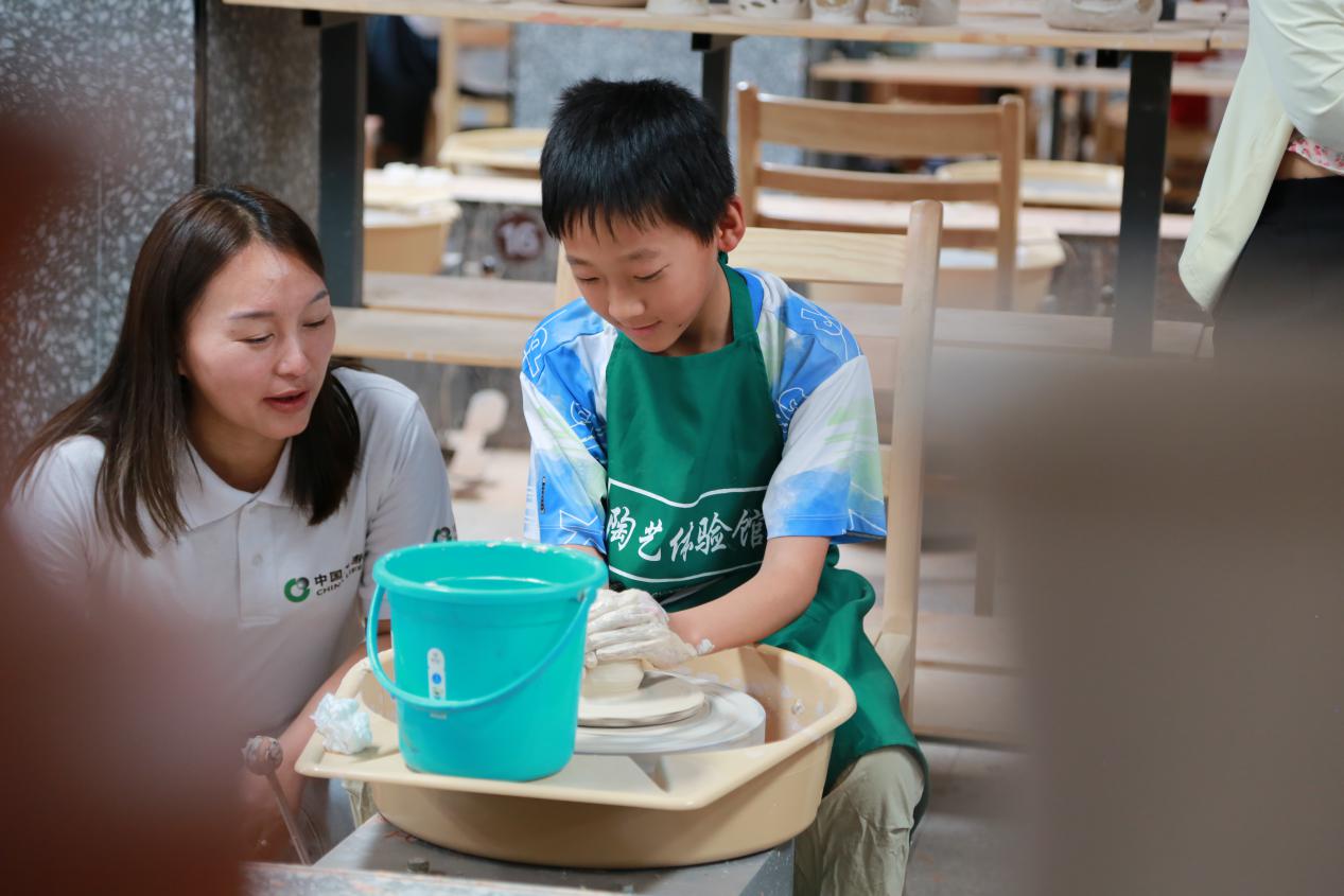 6月14日,在建水紫陶产业学院陶艺实训中心,中国人寿财险红河州中心支公司工作人员化身为“儿童友好指导员”,指导小朋友陶艺制作,感受非遗文化。(薛莹莹摄)