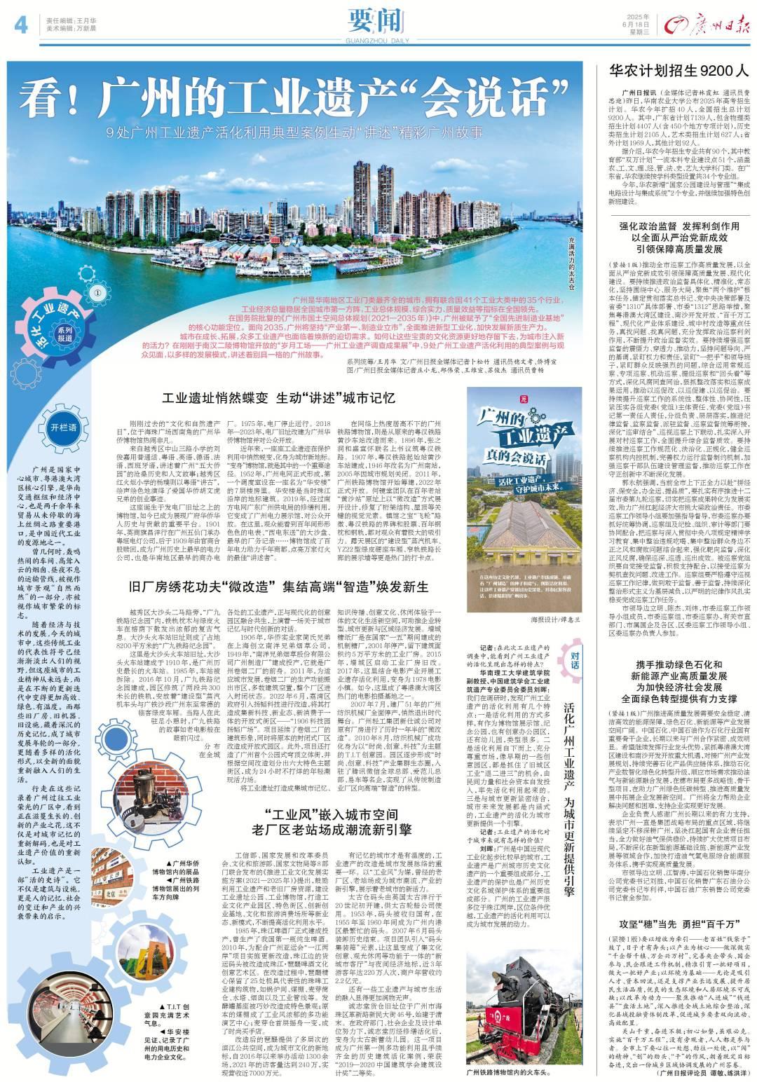 华南理工大学建筑学院副教授、中国建筑学会工业建筑遗产专业委员会委员刘晖:我们在调研时,发现广州工业遗产的活化利用有几个特点:一是活化利用的方式多样,有作为博物馆展示馆、纪念公园,也有创意办公园区,还有幼儿园,类型很多。二是活化利用自下而上、充分尊重市场,像早期的一些创意园区,都是抓住了旧城区工业“退二进三”的机会,由民间力量和社会资本自发投入,率先活化利用起来的。三是与城市更新紧密结合,城市未来发展都是内涵式的,工业遗产的活化为城市更新提供一个引擎。