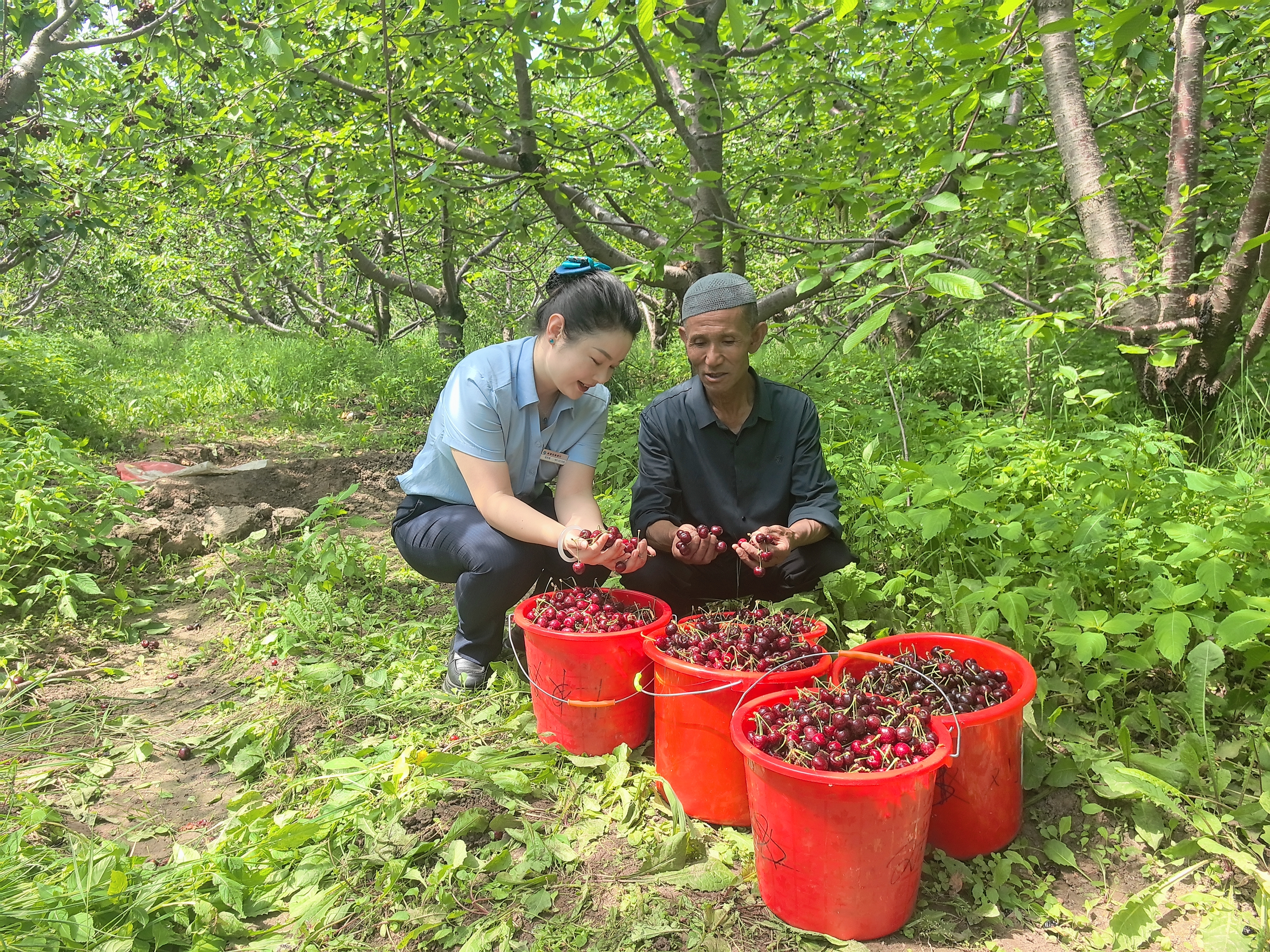 (图为新源农商银行工作人员在恰普河阿吾孜村帮助村民采摘樱桃。赵凡英摄)
