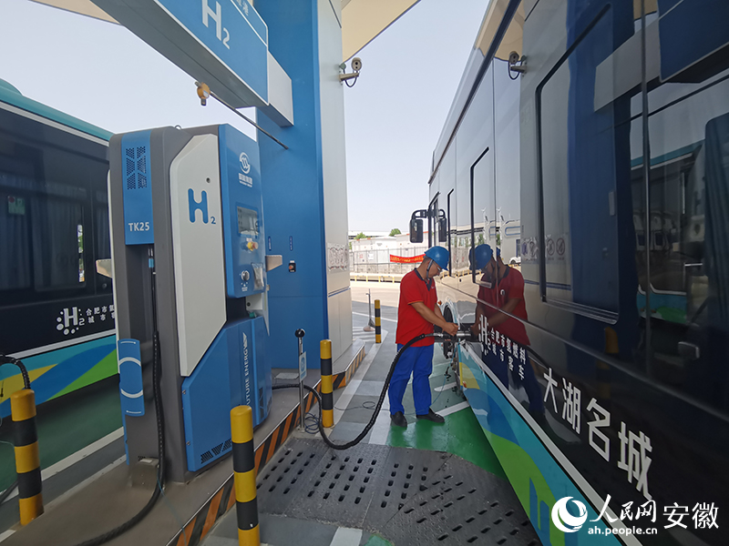 能源港内,工作人员在给氢燃料公交客车加氢。