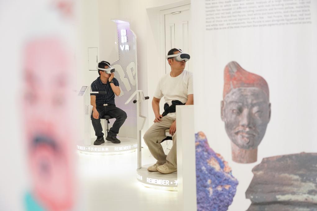 在北京清城睿现数字科技研究院有限公司旗下的RE睿·国际创忆馆,观众体验展示兵马俑影像信息的VR设备(2023年5月14日摄)。新华社记者陈钟昊摄