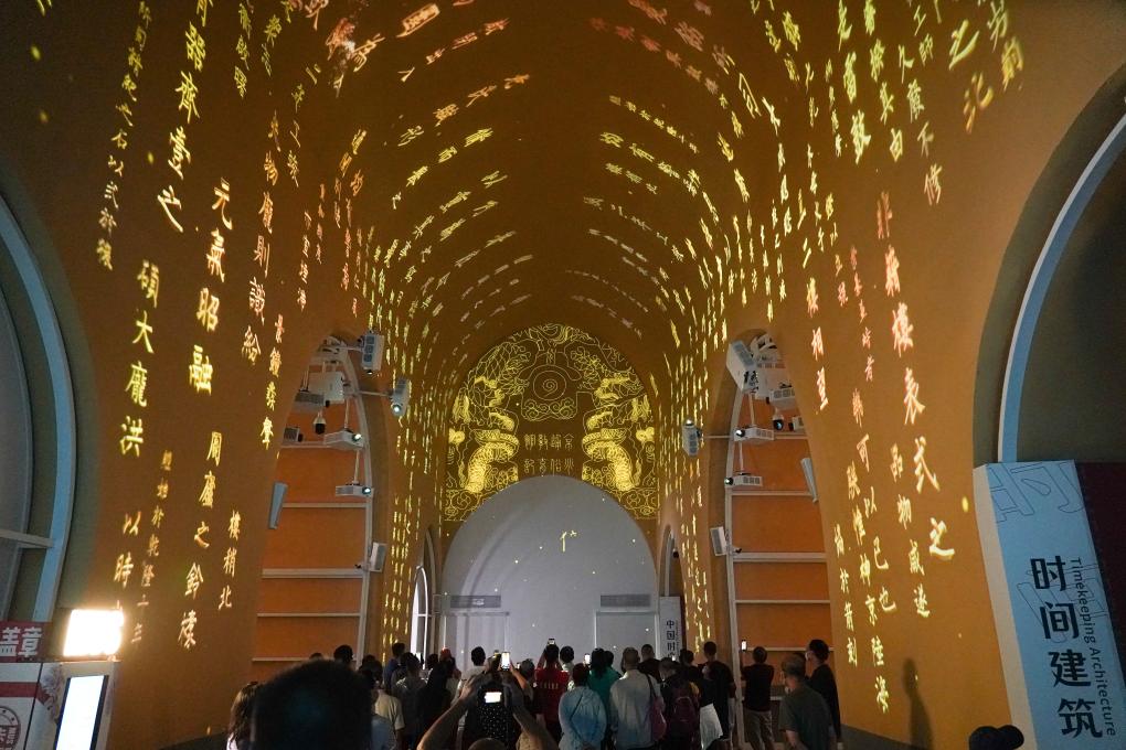 观众在北京鼓楼一层观看“时间的故事”沉浸光影秀。该展览项目由北京清城睿现数字科技研究院有限公司参与设计制作(2022年8月28日摄)。新华社记者陈钟昊摄