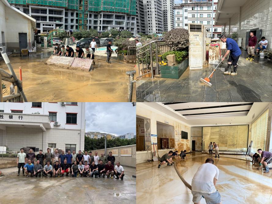 洪水退去,黔东南州分行迅速采购饮用水、食品、消毒用品等物资,组建志愿队前往支援,组建清淤、清理、后勤保障三个专项小组,为高效推进支行恢复生产生活秩序提供有力保障。队员们与支行员工协同开展物资搬运、清淤消杀、受损核查等工作,并安排技术骨干修复电路、网络,全力推动网点恢复营业。