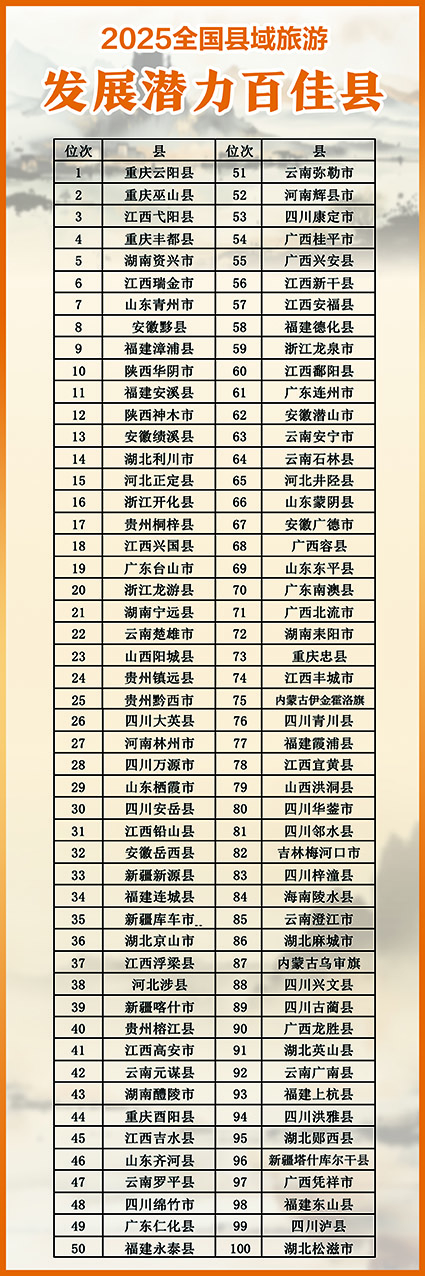 2025年全国县域旅游发展潜力百佳县分布在21个省份。四川最多,占13席;江西占12席,云南和福建8席。重庆云阳、重庆巫山、江西弋阳、重庆丰都、湖南资兴、江西瑞金、山东青州、安徽黟县、福建漳浦、陕西华阴位列前十。