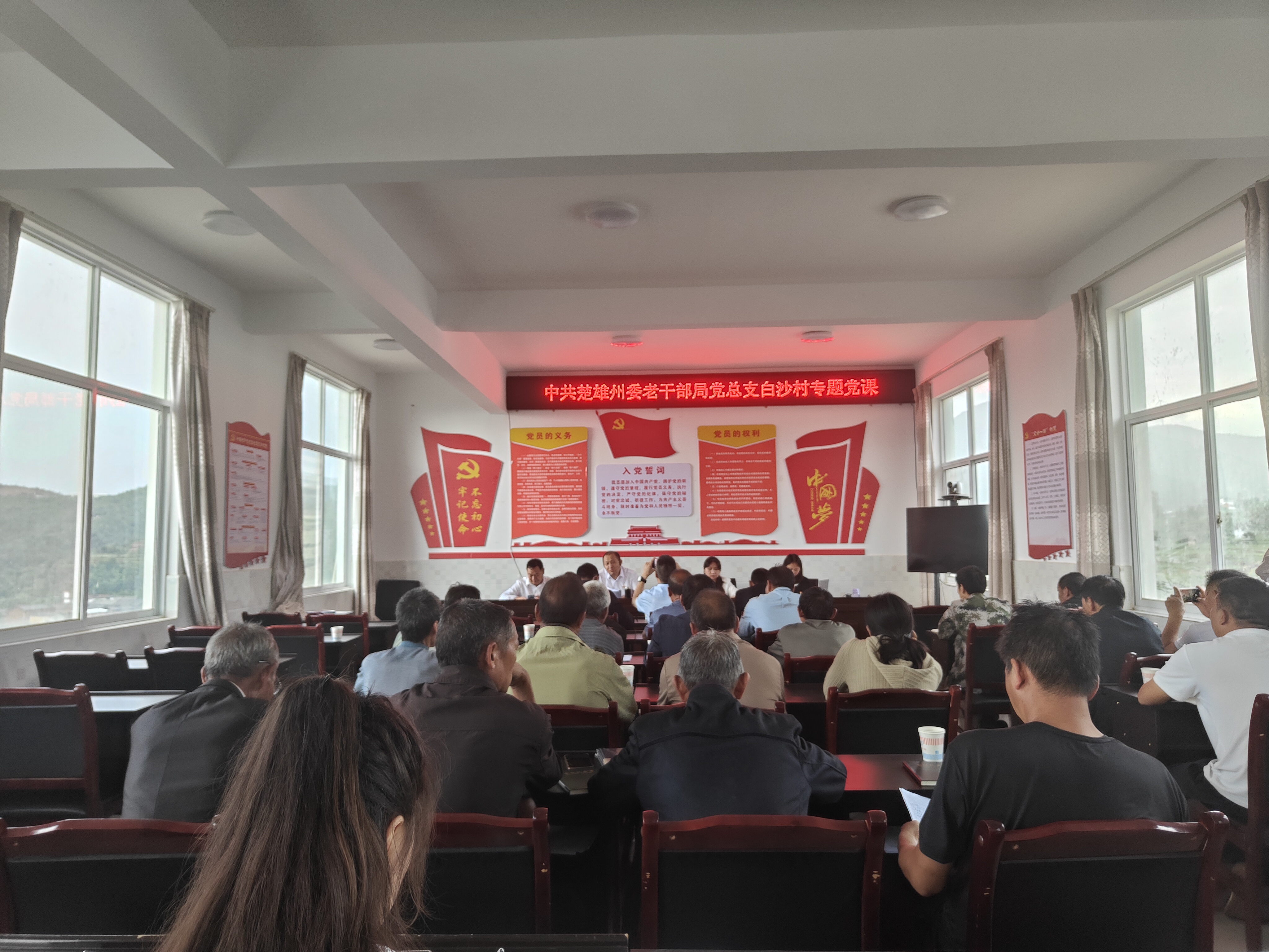 结合扎实开展学习教育,讲授专题党课。楚雄州委老干部局副局长何荻以《扎实开展深入贯彻中央八项规定精神学习教育以党员的好作风凝聚白沙团结发展好民风》为题,为白沙村党员带来了一场深刻且生动的党课。他带领大家共同学习楚雄州农村中带领群众致富、积极推动乡村治理的党员干部先进典型事迹,通过一个个鲜活的案例,展现了优秀党员干部的担当与奉献精神。同时,也列举了部分农村党员干部因损害集体利益、酒驾醉驾违法、奢华攀比享乐而受到党纪国法惩处的反面案例,以“身边事”警醒“身边人”,引导党员和村干部深刻认识到坚守政治底线的重要性,激励他们不断提升本领能力,在带领群众增收致富中发挥模范带头作用,为白沙村的团结发展凝聚起强大的精神力量。