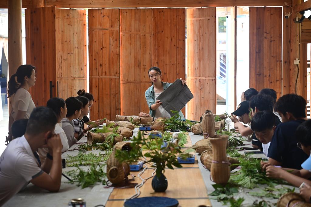 7月1日,杨成兰(中)在贵州榕江县栽麻镇丰登侗寨的工坊里向游客讲解侗布的植物染色技法。新华社发(徐凌豪摄)