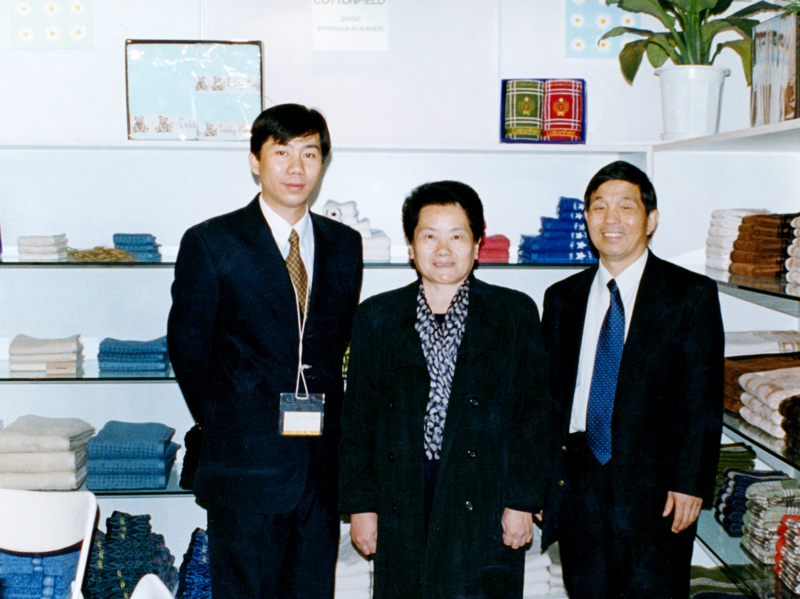 2000年北京中国纺织品博览会上,原中国纺织工业部部长吴文英(中)、原中国家用纺织品协会会长杨东辉(右)在中国“无印良品”毛巾展位前与马涛(左)合影。