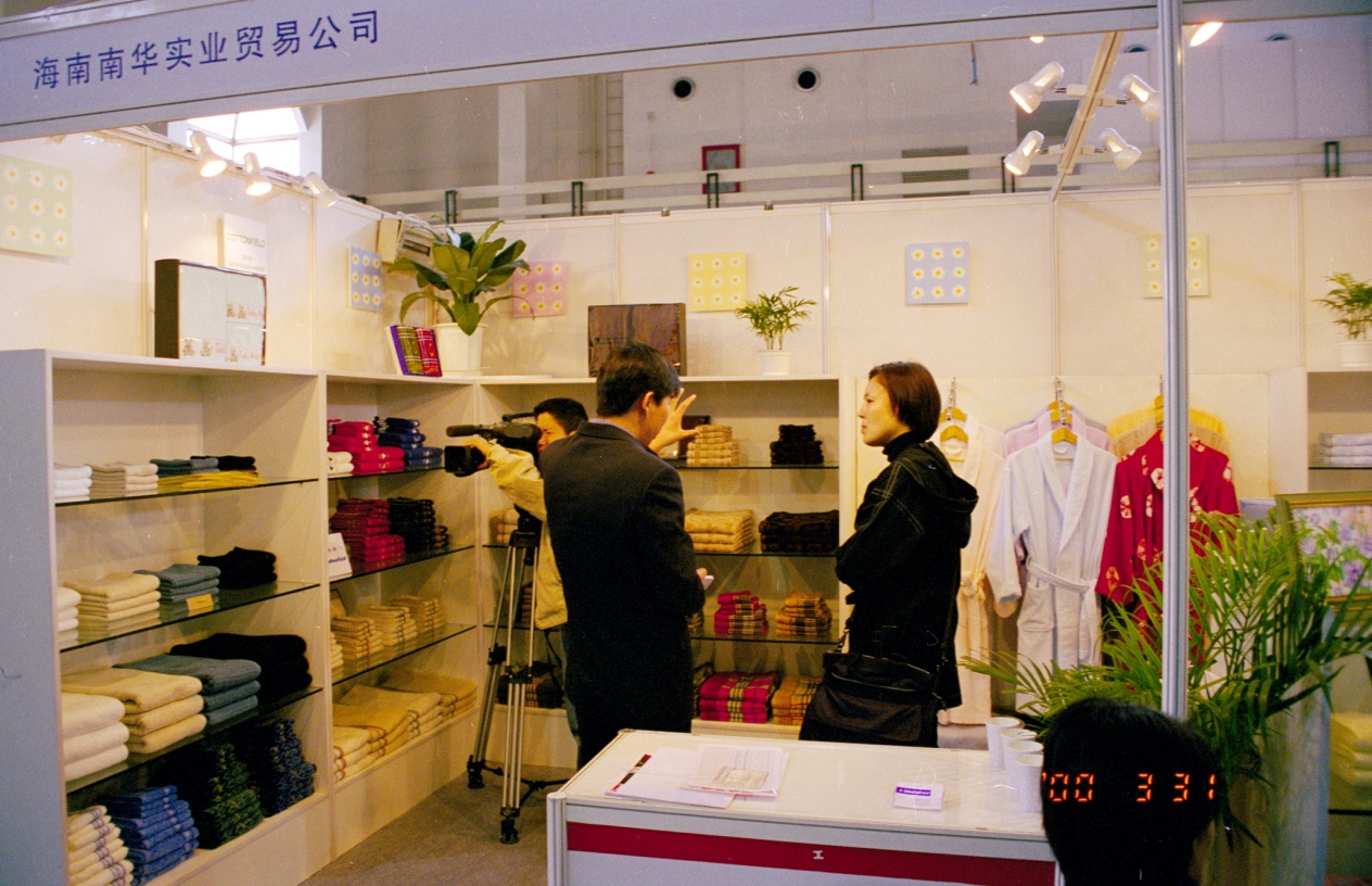 媒体在2000年北京中国纺织品博览会上采访中国“无印良品”毛巾。
