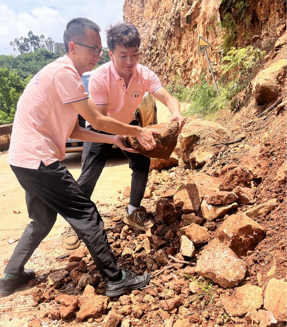 然而,次日路途艰险更甚,山雨之后落石不断滚落,前路几近阻塞。他们四人没有丝毫迟疑,毅然下车。面对横亘于前的嶙峋乱石,以双手为锄,徒手搬开那些棱角尖锐、沾满泥浆的石块,一点一点清理路上大大小小的落石。汗水与雨水交织,手指在搬运石块中被磨破,但前进的方向始终清晰坚定:清理一段,车辆前行一段。经过近两小时的艰难疏通,终于开辟出通往利民乡竹鸡河村的道路。