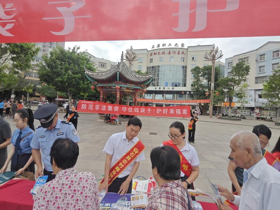 为积极履行社会责任,普及金融安全知识,进一步提高群众对非法集资的防范意识和识别能力,2025年6月在云南省石屏金融监管支局领导下,石屏农村商业银行组织开展了防范非法集资宣传月活动。