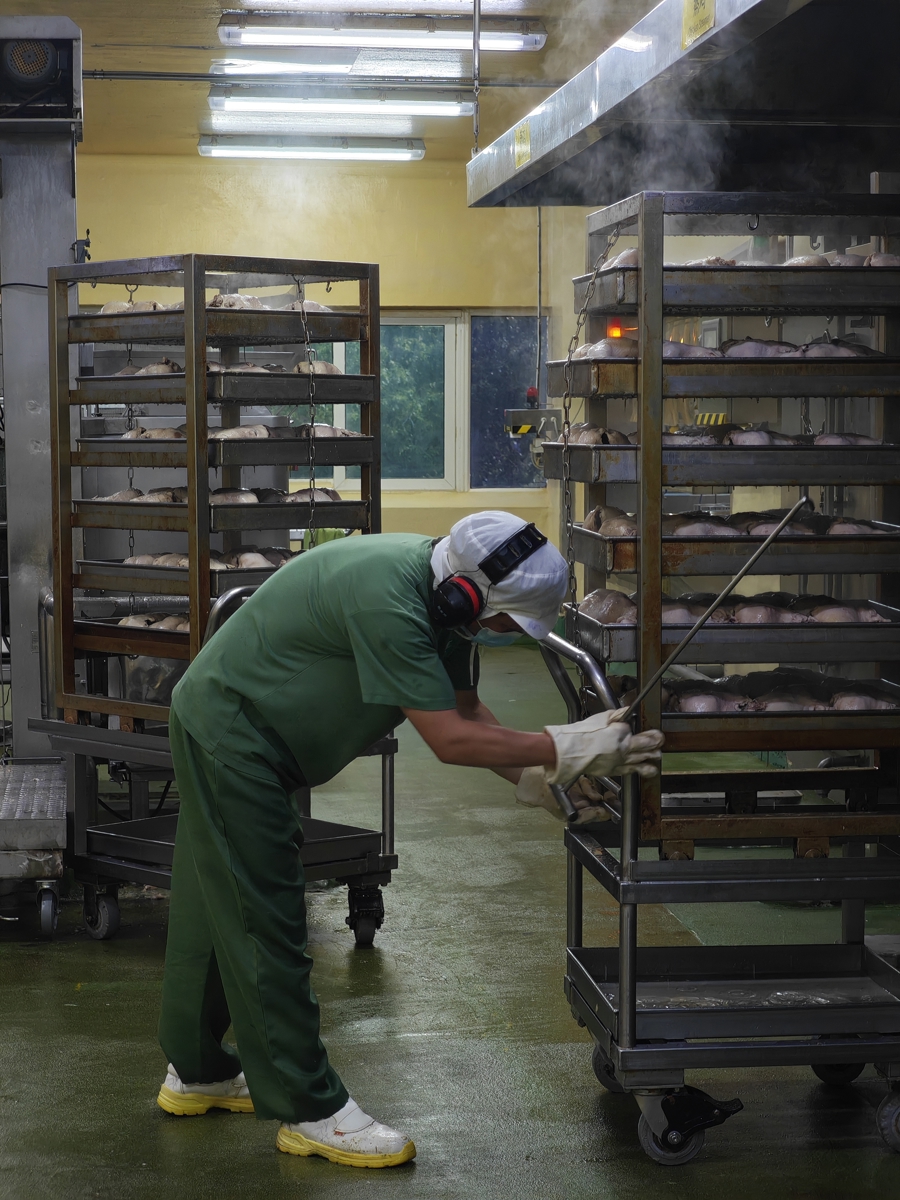 太太乐鸡精生产线,工作人员取出经过高温蒸制的鸡。吴越摄