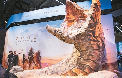 2024年8月21日,一名观众在德国科隆国际游戏展腾讯游戏展台为《沙丘:觉醒》模型拍照。