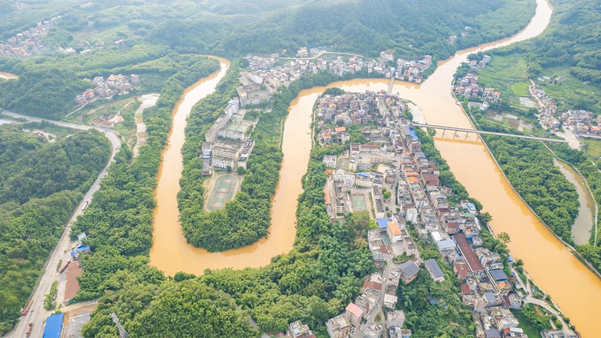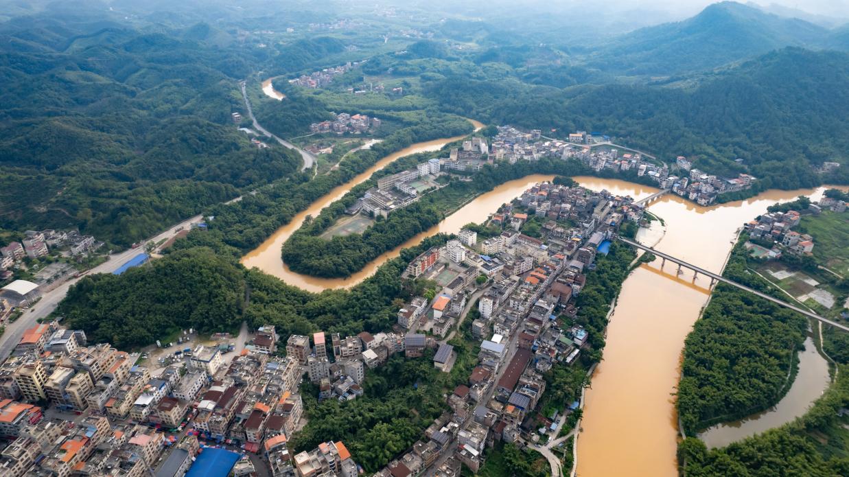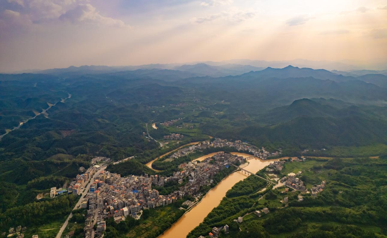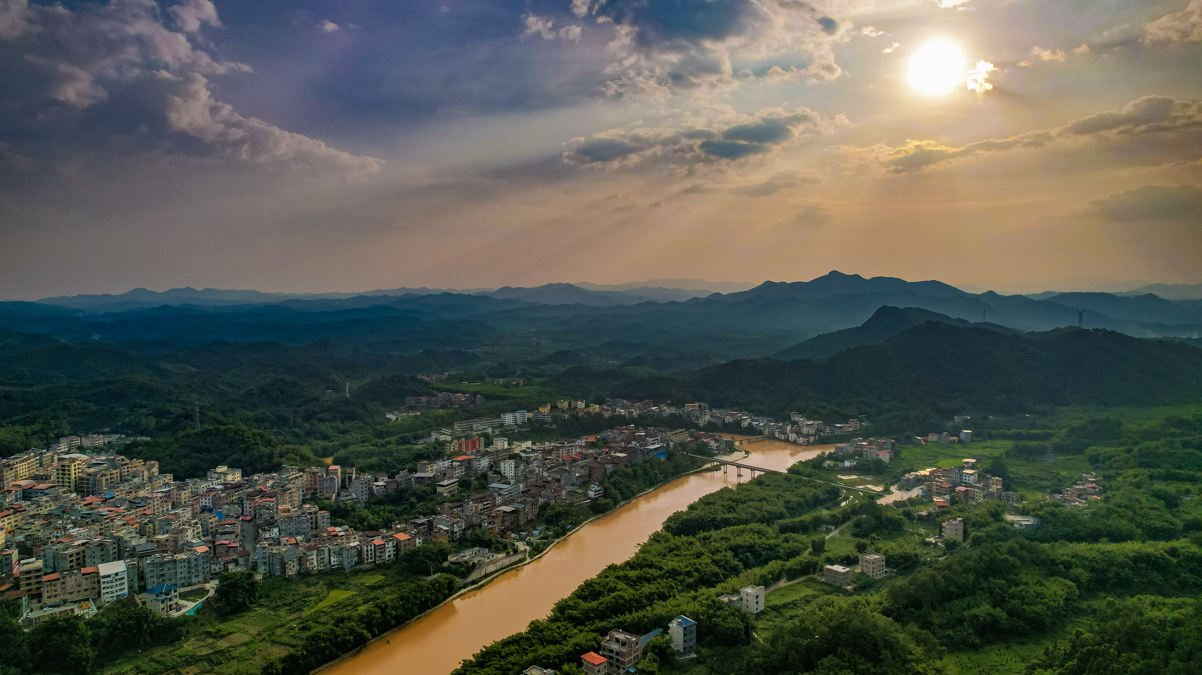 2025年7月19日,广西苍梧县梨埠镇在夕照映照下,静谧秀美,熠熠生辉,令人神往。
