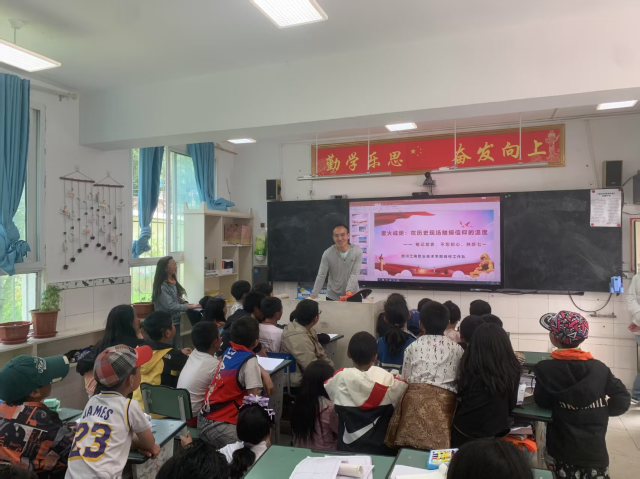 四是红色课堂育新人。发挥思政教师专长,四是红色课堂育新人。作为思政教师,我始终将思想引领融入驻村工作。今年5月,受丹巴县委组织部邀请,为2025年乡科级干部进修班讲授习近平法治思想专题课。结合磨子沟村土地纠纷调解、邻里矛盾化解等实例,从基层治理角度解读法治思维,让学员们明白“法治不是理论,是解决问题的工具”,课后不少人说“这堂课接足了地气”。青少年是乡村的未来。我走进边尔小学校,以“星火成炬”为题讲思政课,结合当地革命故事与历史遗迹,以生动的案例、鲜活的语言为同学们讲述党领导人民奋斗的历程。从身边的红色印记到先辈的英雄事迹,引导孩子们在历史场景中感受信仰的力量,明白今天的幸福生活来之不易,当问“和平年代如何传承信仰”,有孩子说“要建设家乡”,有孩子说“要帮助他人”。这堂课不仅让红色历史扎根童心,更播下了信仰的种子,让他们懂得理想的力量能跨越时空、照亮未来。