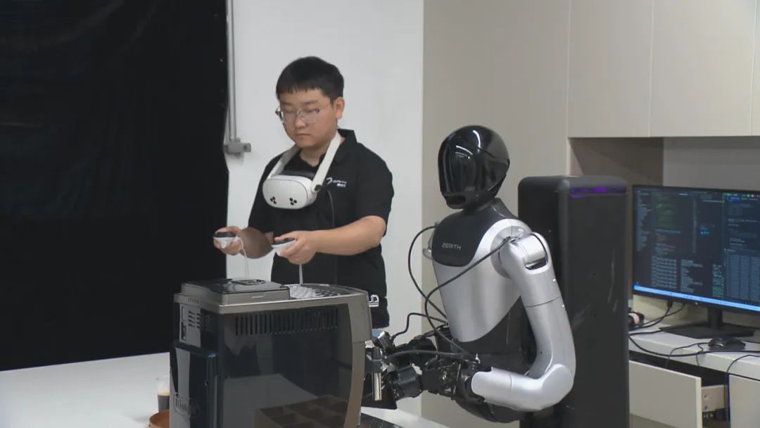 我们现在来到了合肥零次方机器人有限公司,大家看到我身旁这台正在模仿人倒咖啡的H1机器人,它应用灵活,可以完成许多自主任务,而这正是得益于过去3个月在机器人大学训练场积累的17万条数据训练成果。