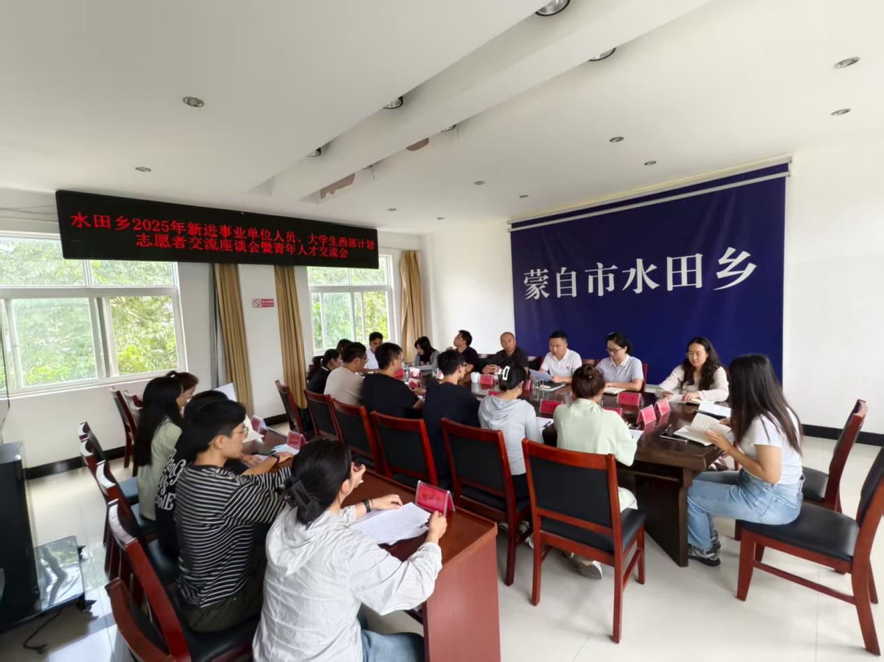 8月1日上午,云南省蒙自市水田乡政府小会议室里,坐满了面容青涩、略带紧张的一批青年,他们有2025年新考入水田乡工作的事业单位人员和大学生西部志愿者,也有部分青年干部。每个人的座位上都有桌签,这“小小”的桌签,也许是大部分青年人生中首张桌签。这简单而庄重的布局,原来是水田乡召开2025年新进事业单位人员、大学生西部志愿者交流座谈会暨青年干部座谈会。