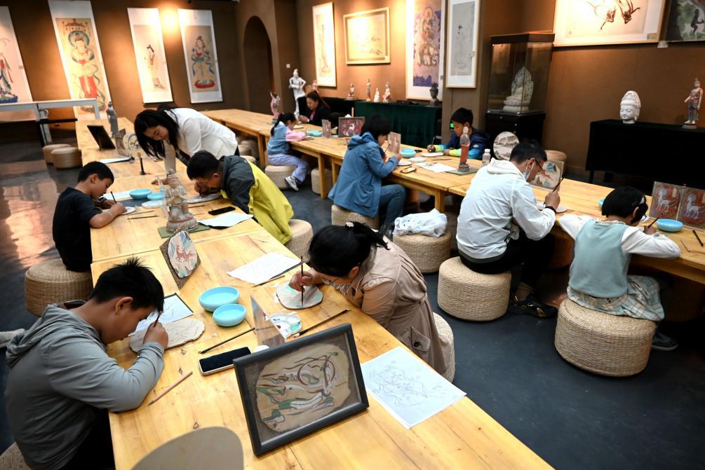 2025年5月4日,游客在甘肃省敦煌小镇研学课堂上学习临摹敦煌壁画。新华社发(张晓亮摄)