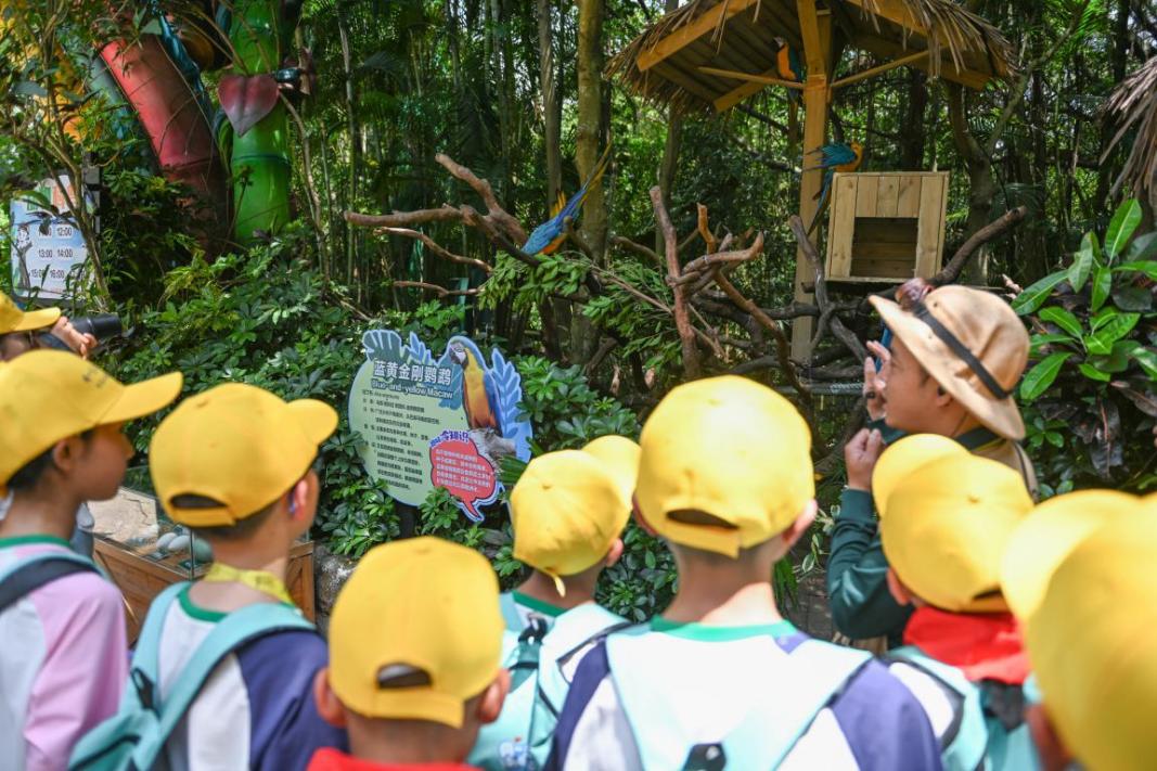 2025年6月9日,参加研学游的学生们在广州长隆野生动物世界参观蓝黄金刚鹦鹉。新华社记者肖恩楠摄
