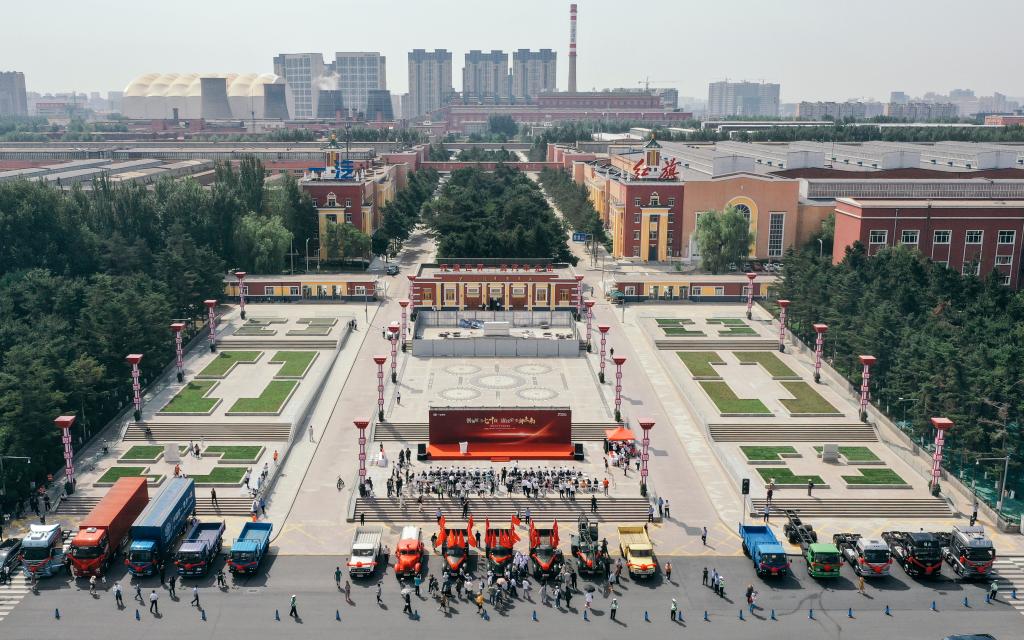 一汽解放卡车在中国第一汽车集团有限公司厂区一号门前进行集中展示(无人机照片)。新华社记者许畅摄