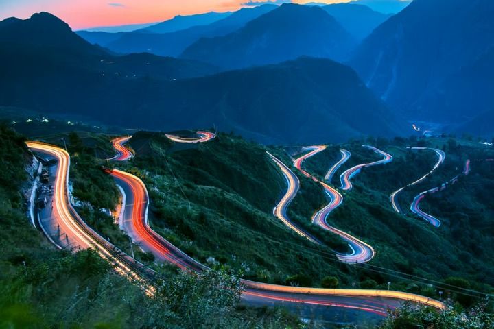 云南省易门县县城通往绿汁镇的“72道拐108道弯”延时照片。