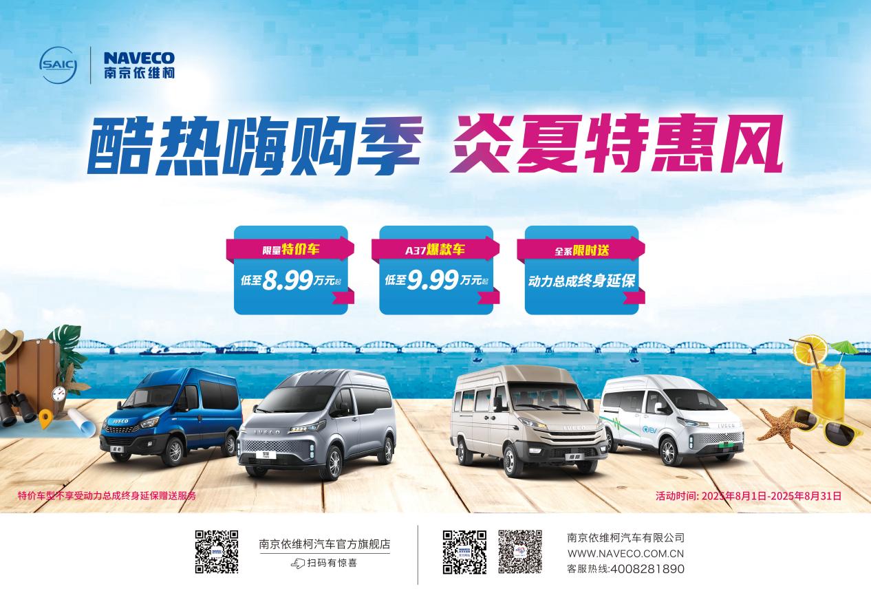 热浪滚滚,福利更燃!南京依维柯“酷热嗨购季,炎夏特惠风”主题促销盛宴火爆开启!即日起至8月31日,限量特惠车型低至8.99万元起,明星爆款得意A37限时9.99万元起,全系车型尊享动力总成终身延保,让您清凉一夏,畅享无忧出行!