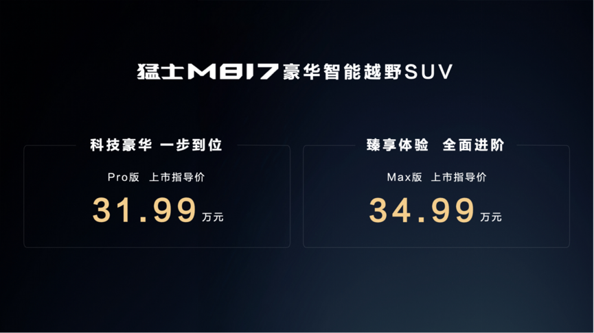 活动上,猛士M817宣布正式上市,其中猛士M817Pro版上市指导价31.99万元,猛士M817Max版上市指导价34.99万元,即日起至9月30日下订,限时尊享至高价值超7万元的8重上市首销专属权益。