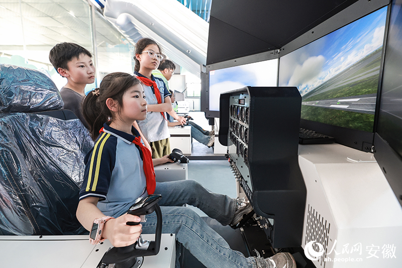 小朋友在东方飞谷飞行营地体验模拟飞行。人民网记者 张俊 摄