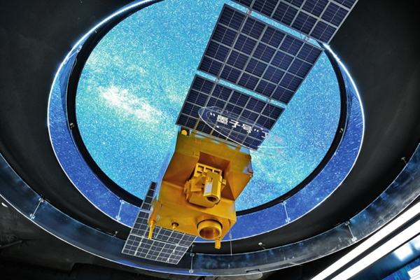 在位于合肥的中电信量子信息科技集团有限公司科技体验馆内的“墨子号”量子卫星模型(2025年7月1日摄)张铖 摄/本刊