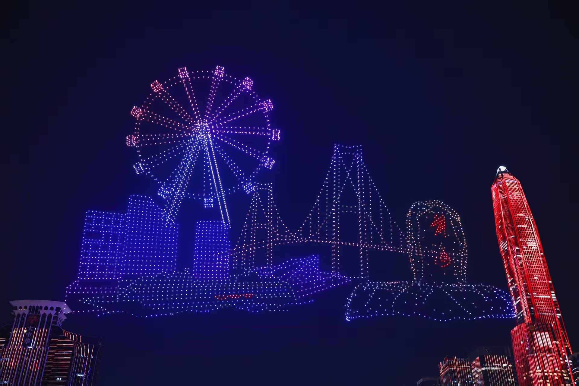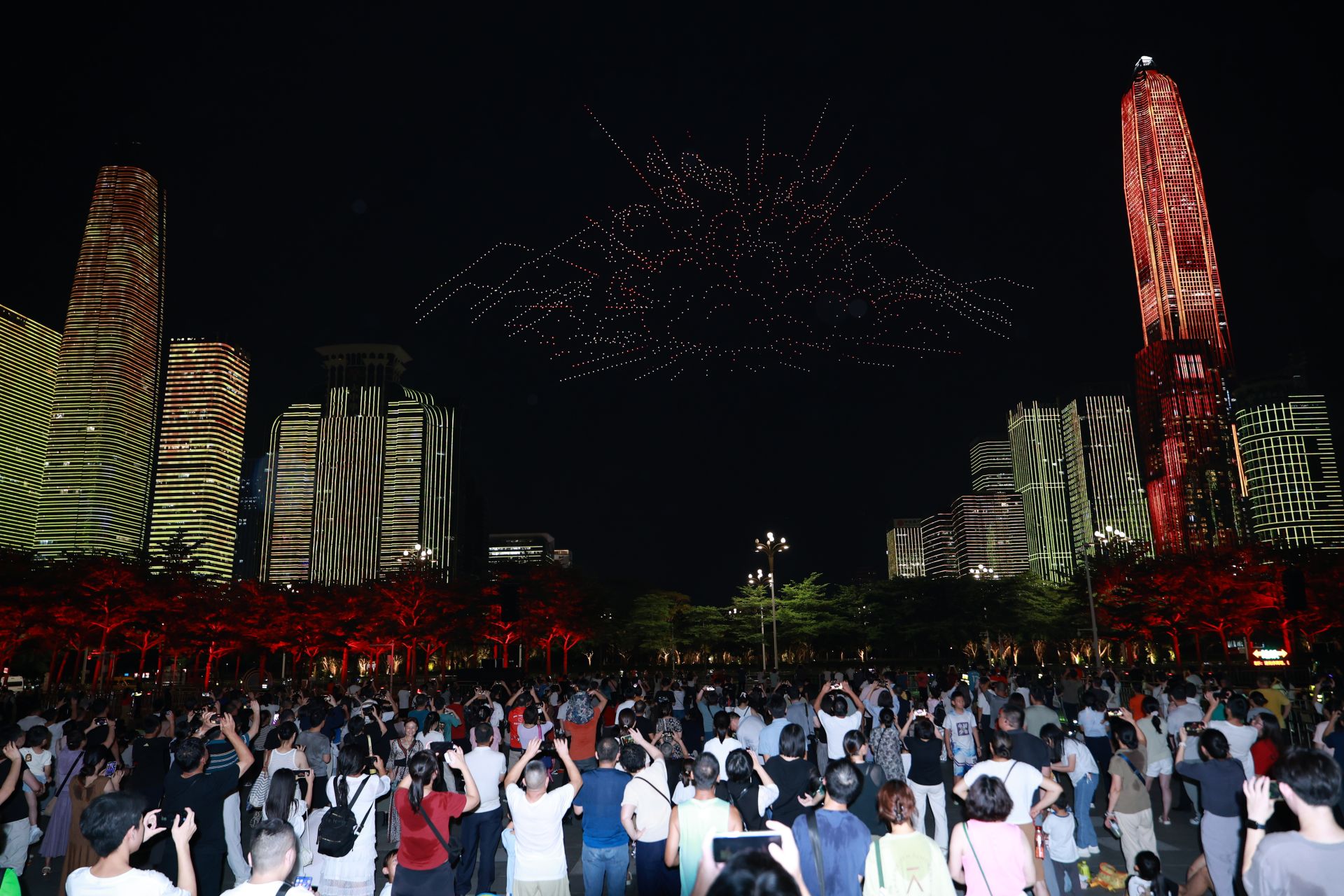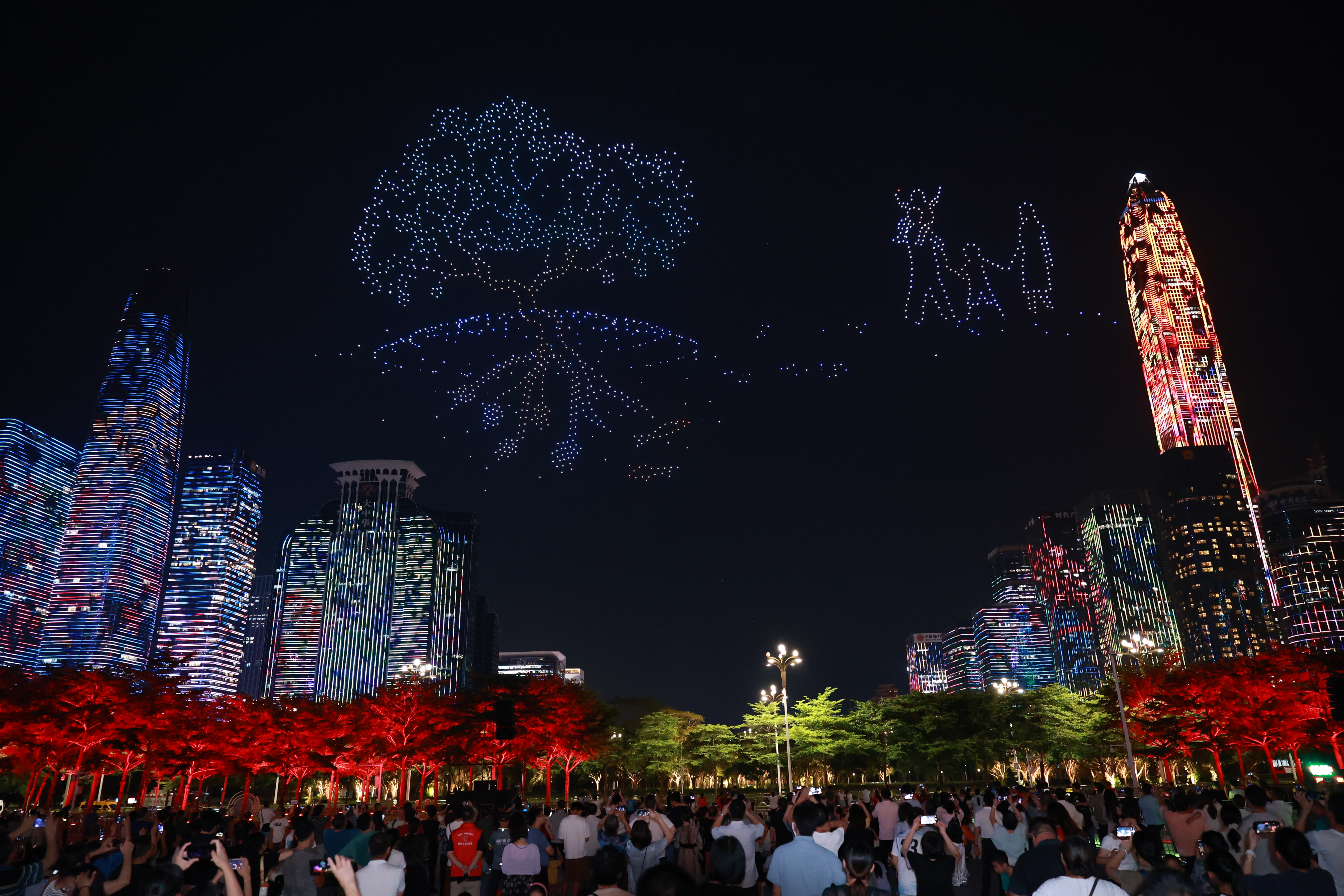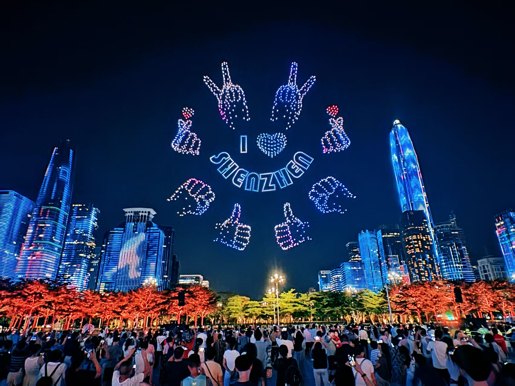 本次演出采用全球首创「1+2+N」模式,“1”即一城全景沸腾,深圳市各区、大鹏新区、深汕特别合作区和前海合作区地标同时点亮,共同勾勒特区发展长卷;“2”为双核梦幻主场,深圳市民广场、深圳人才公园不同篇章同步上演,以“梦幻联动”向城市致敬;“N”指全域光影漫游,深圳市16处灯光秀场与无人机编队实时联动同频共振,以整座城市为舞台,实现全民共享、近悦远来。