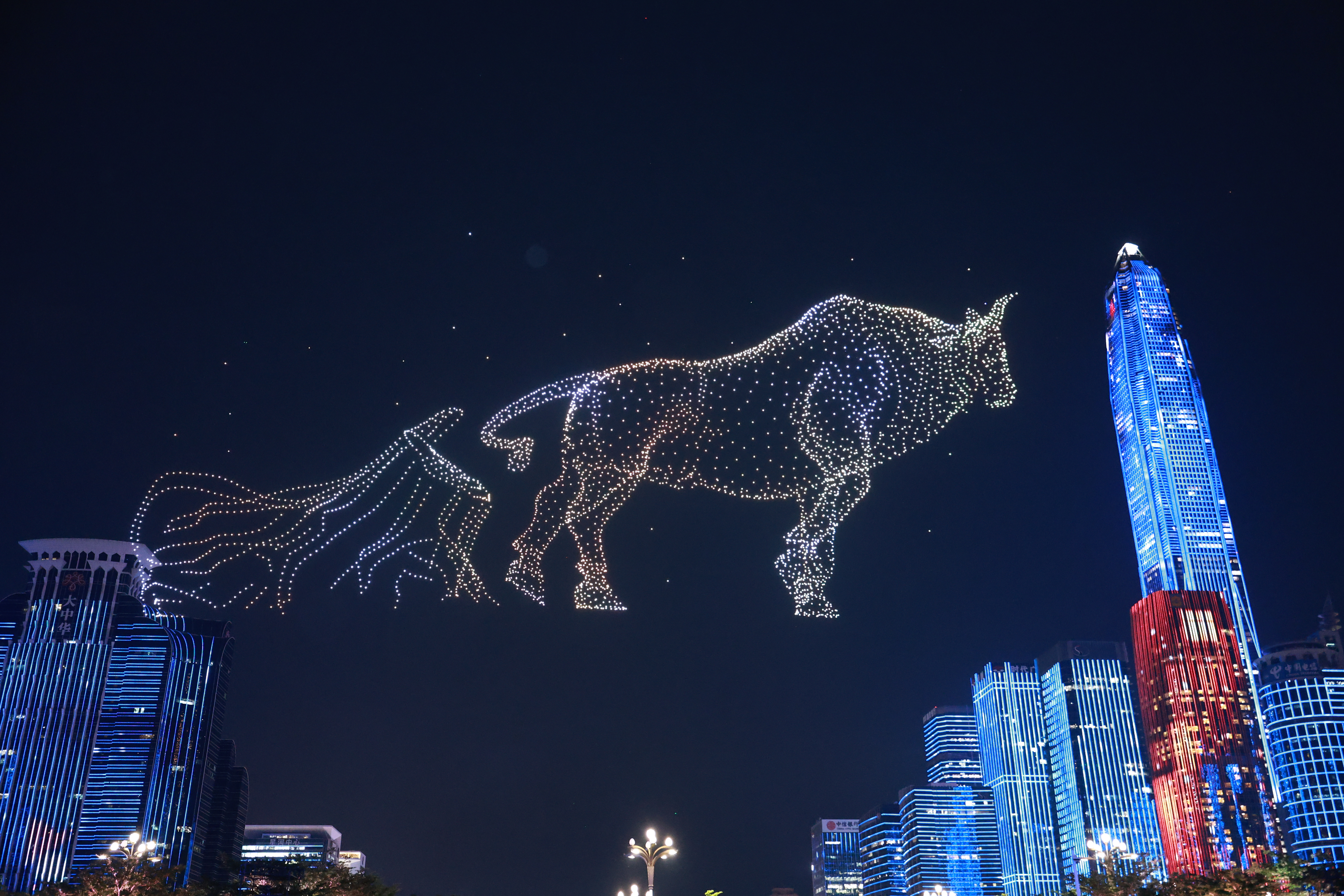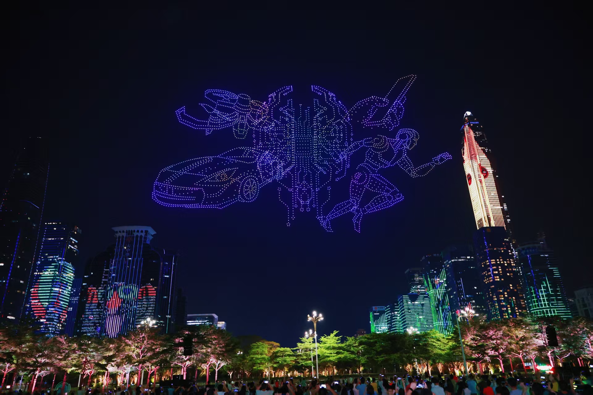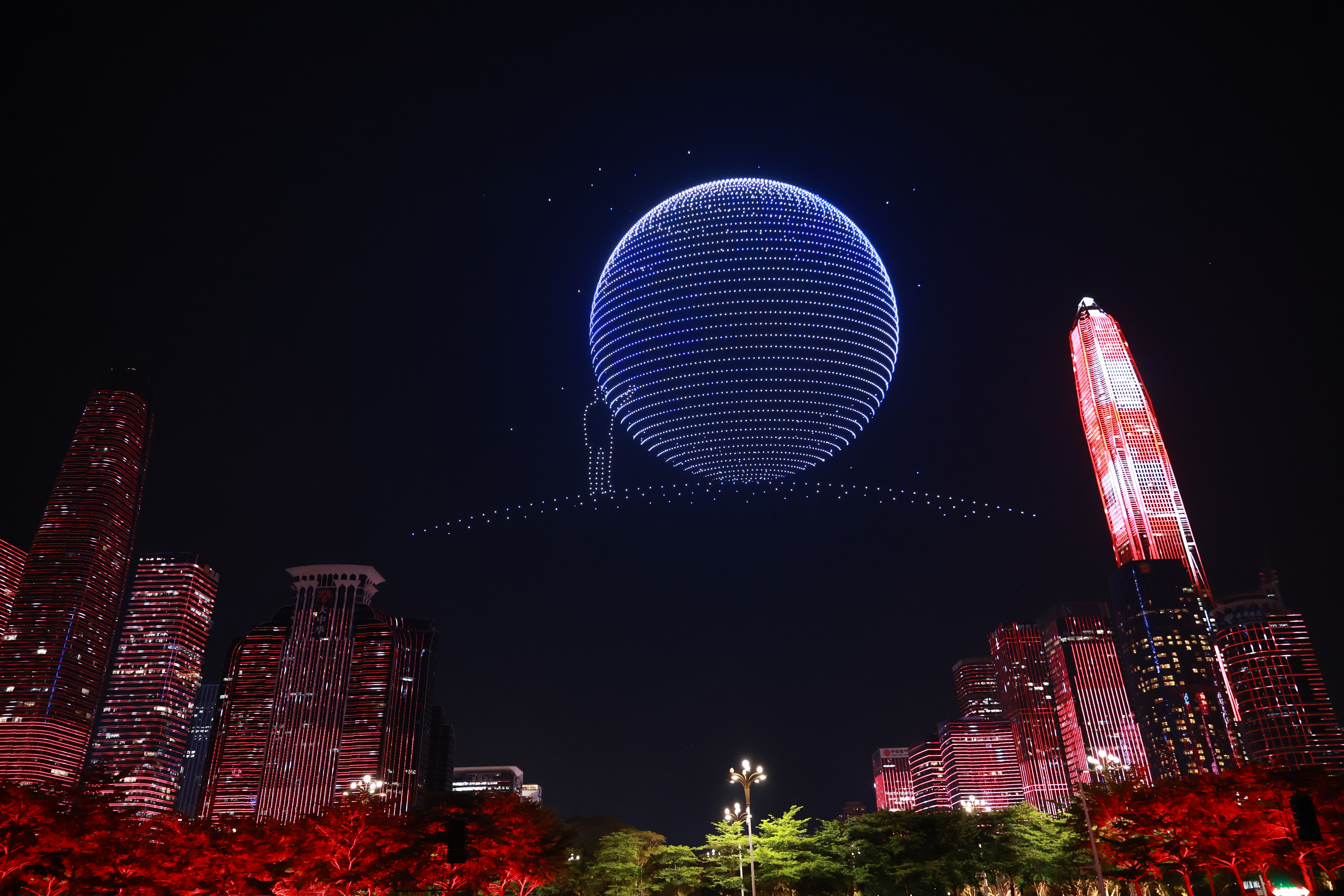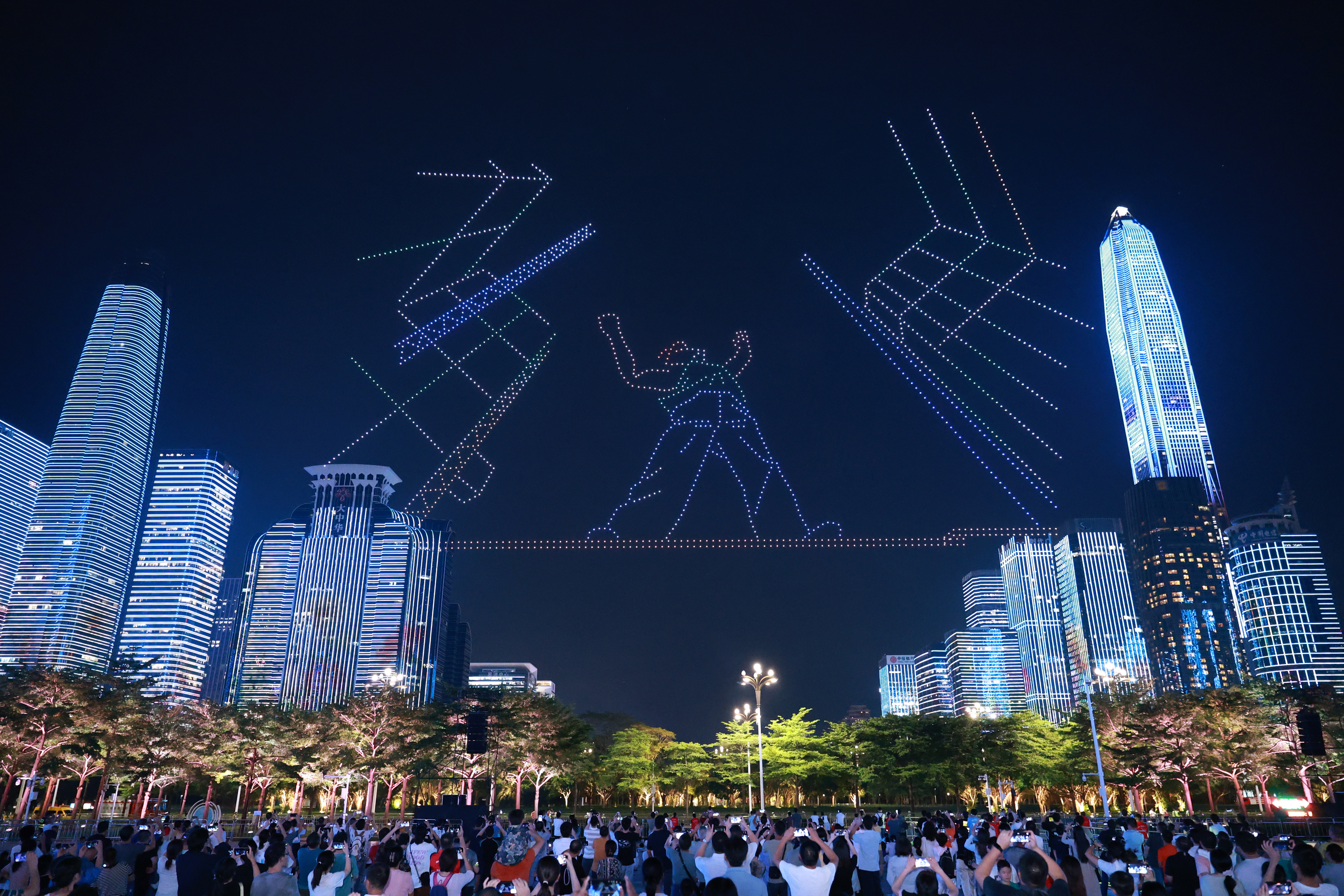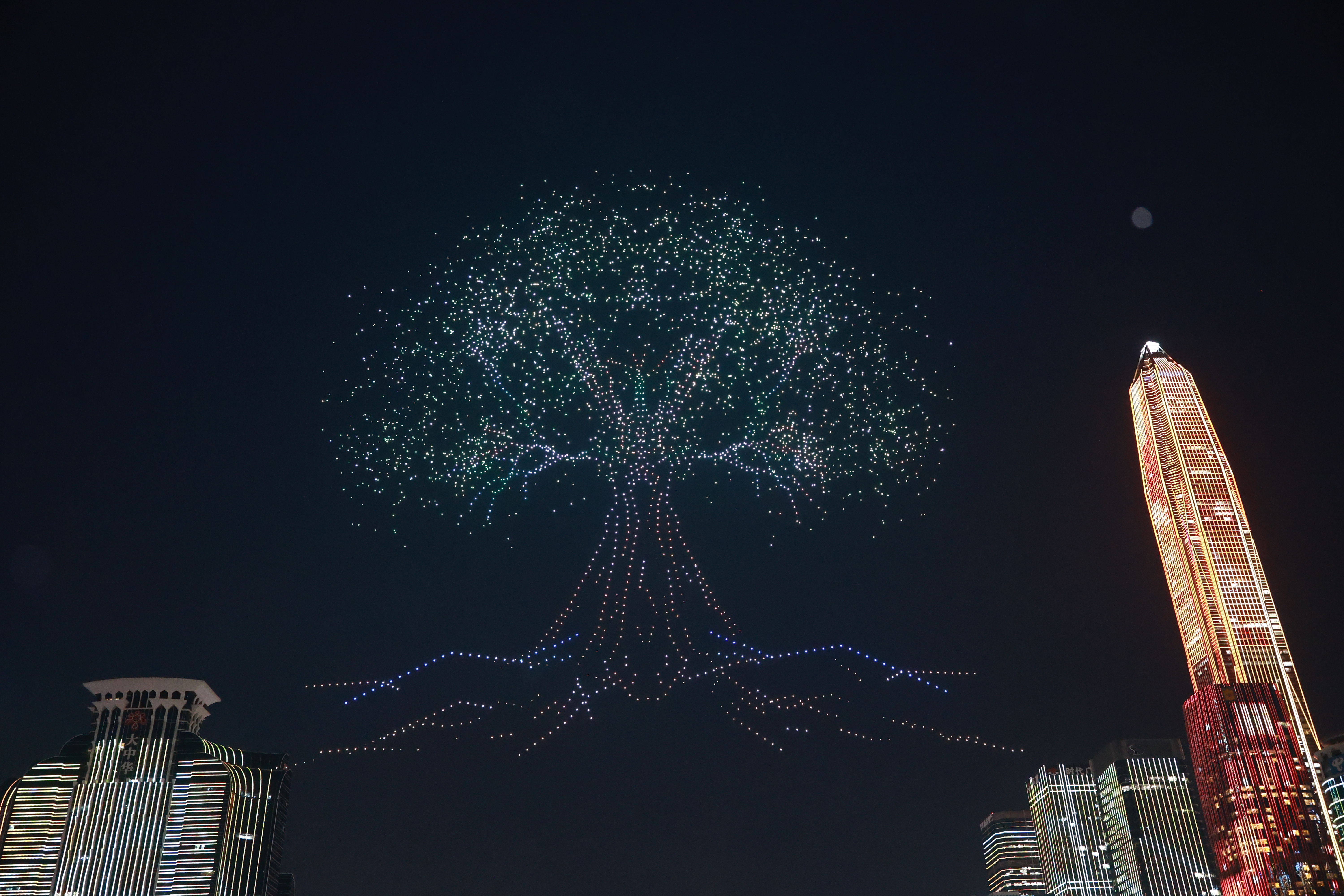本次演出采用全球首创「1+2+N」模式,“1”即一城全景沸腾,深圳市各区、大鹏新区、深汕特别合作区和前海合作区地标同时点亮,共同勾勒特区发展长卷;“2”为双核梦幻主场,深圳市民广场、深圳人才公园不同篇章同步上演,以“梦幻联动”向城市致敬;“N”指全域光影漫游,深圳市16处灯光秀场与无人机编队实时联动同频共振,以整座城市为舞台,实现全民共享、近悦远来。