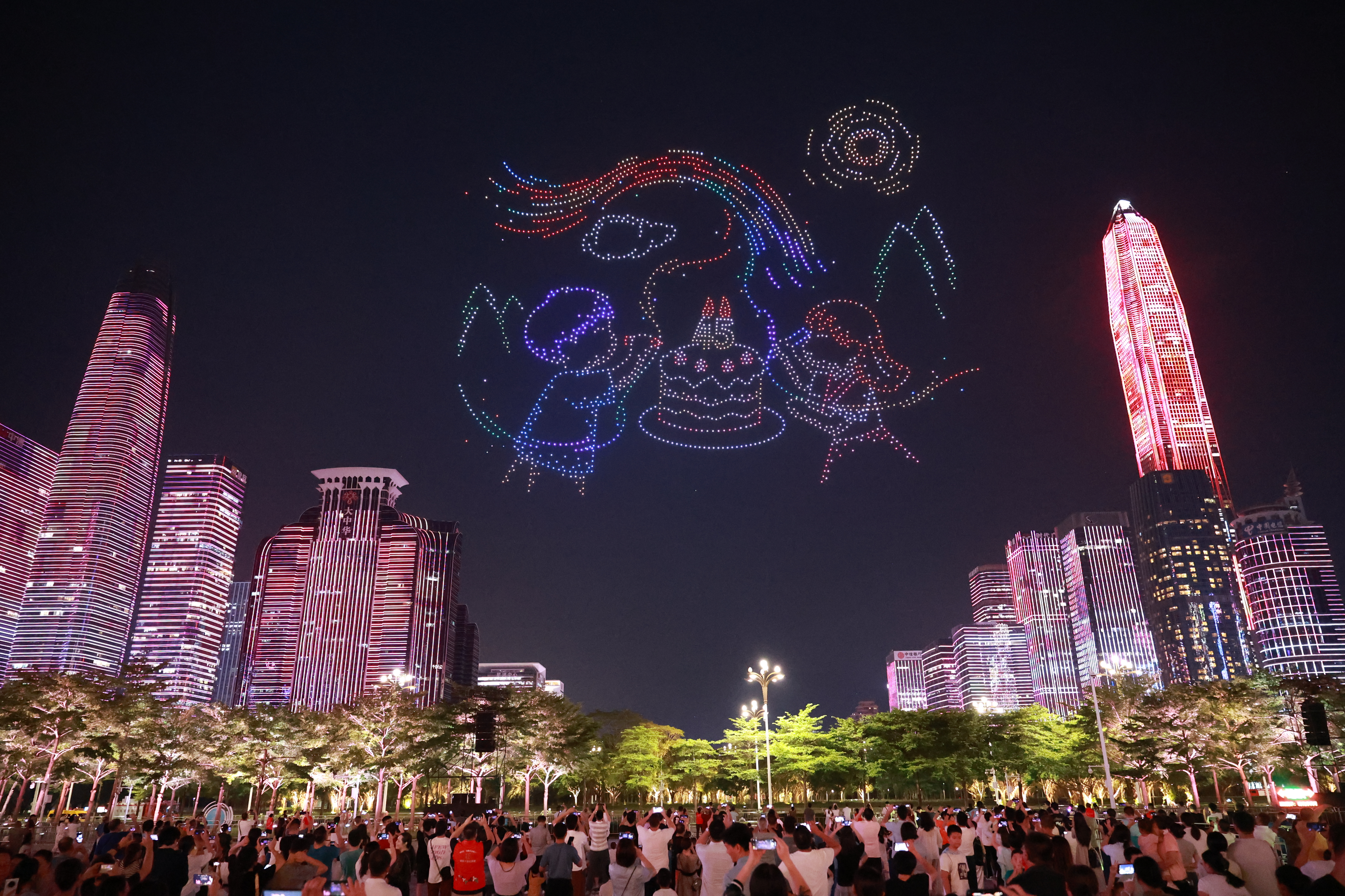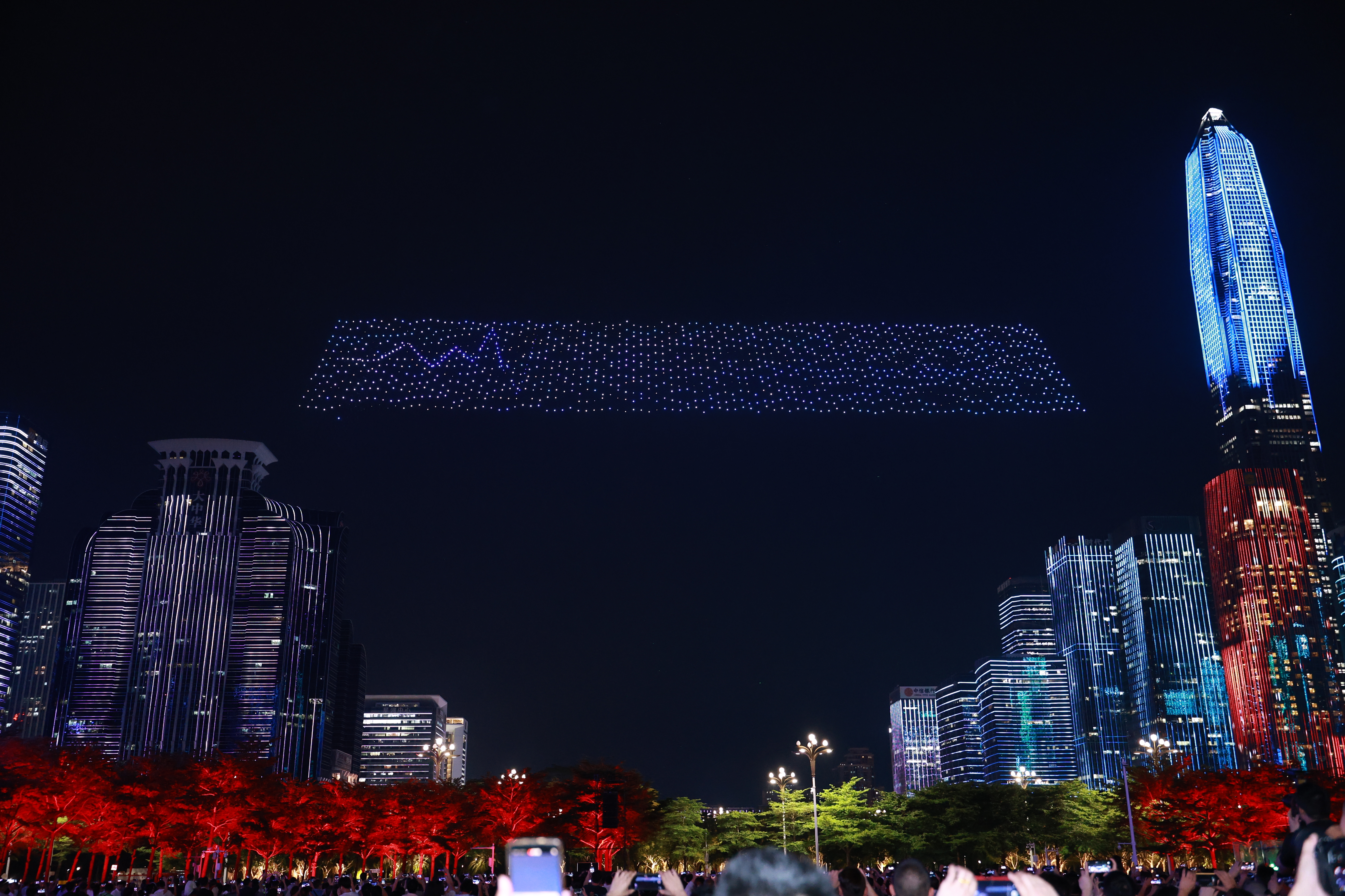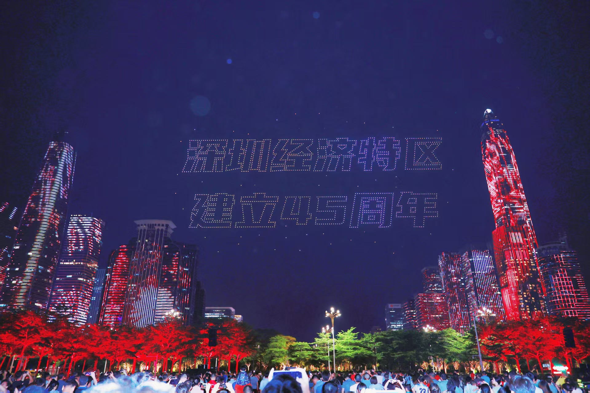 8月26日晚上8时26分,深圳经济特区建立45周年无人机灯光秀表演在深圳市民广场、深圳人才公园双主场同时举行。1.2万架无人机腾空而起,与城市灯光秀交相辉映,以天空为幕、以科技为笔,为市民游客献上了一场科技与艺术共舞的视觉盛宴,向世界生动讲述了深圳经济特区建立45年的发展奇迹。