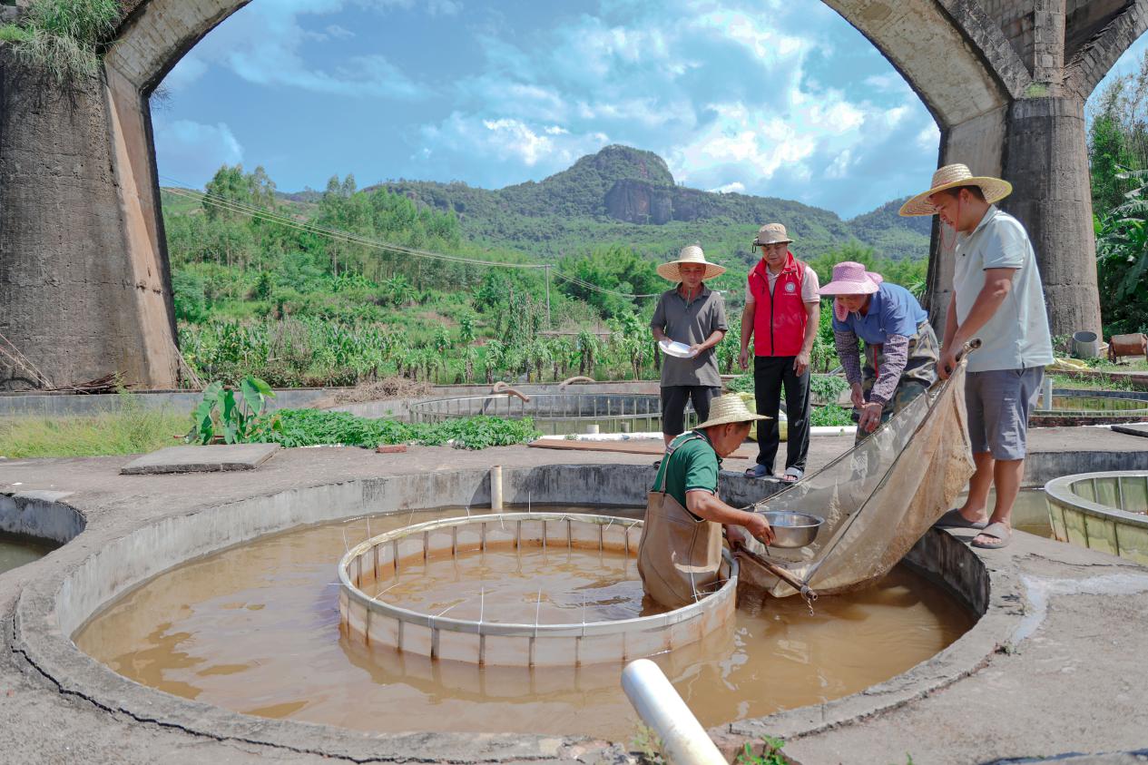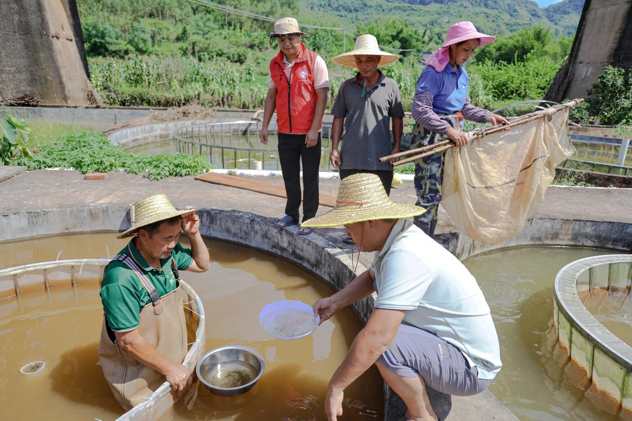 2025年8月30日,在广西梧州市藤县太平镇安福村的自治区级水产良种场藤县齐心四大家鱼良种场,自治区科技特派员和科技人员正在催产池查看鱼苗的培育情况。