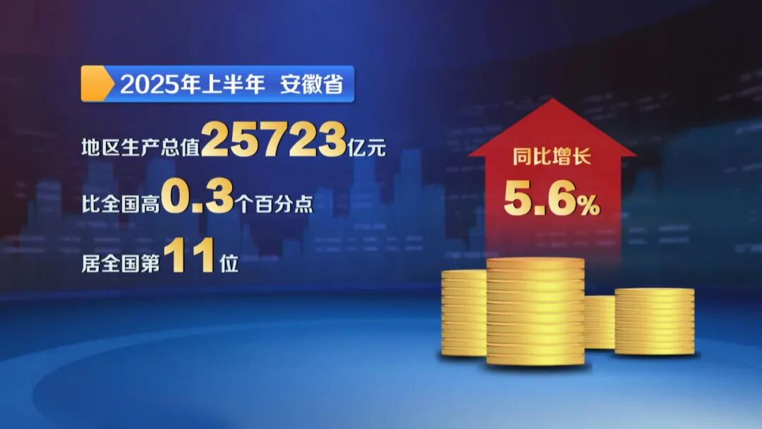 今年上半年,安徽实现地区生产总值25723亿元,同比增长5.6%,比全国高0.3个百分点,居全国第11位;7月份,全省规模以上工业增加值同比增长9%,比全国高3.3个百分点,居全国第3位;进出口总额847.9亿元,同比增长8.5%,增幅居长三角第1位;主要指标继续呈现较快增长、优于全国的良好态势。